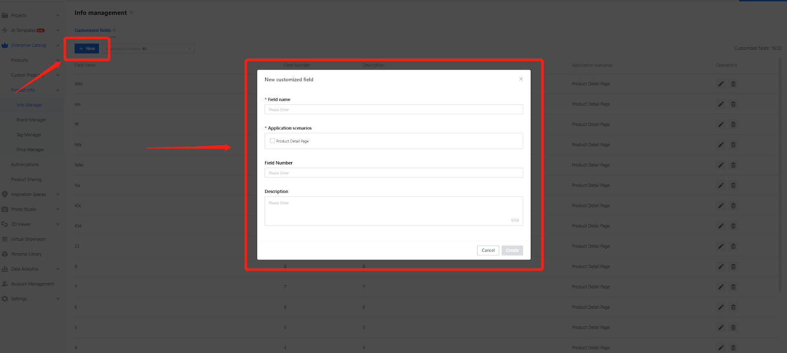 Step2:Click【New】to create a customized field, and fill in the basic information,choose 【Create】
