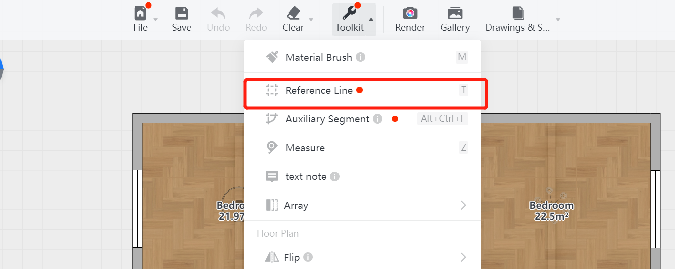 To access the "Reference Line" function: Click on the top bar "Toolkit" → "Reference Line" (You can directly activate the "Reference Line" function using the shortcut "T").