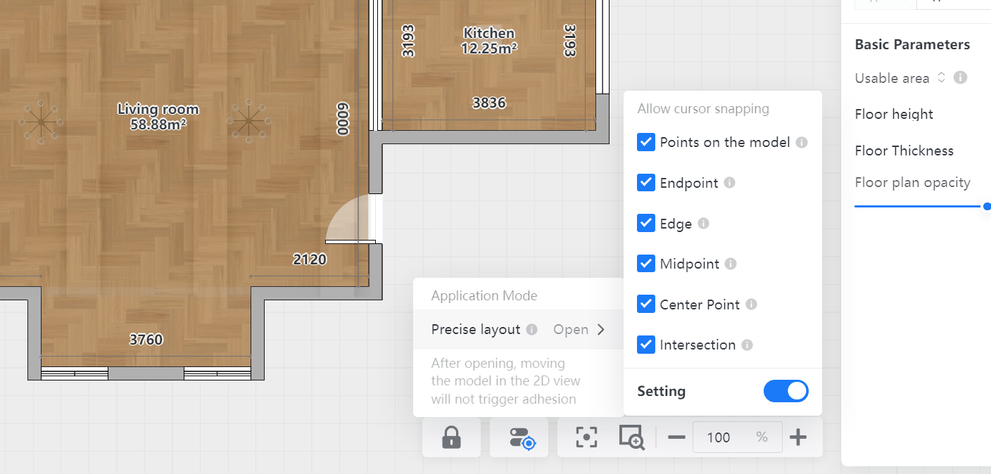 After activating "Precise Layout", you can customize control by turning on and off the snap points in the panel to determine whether the mouse can snap to them.