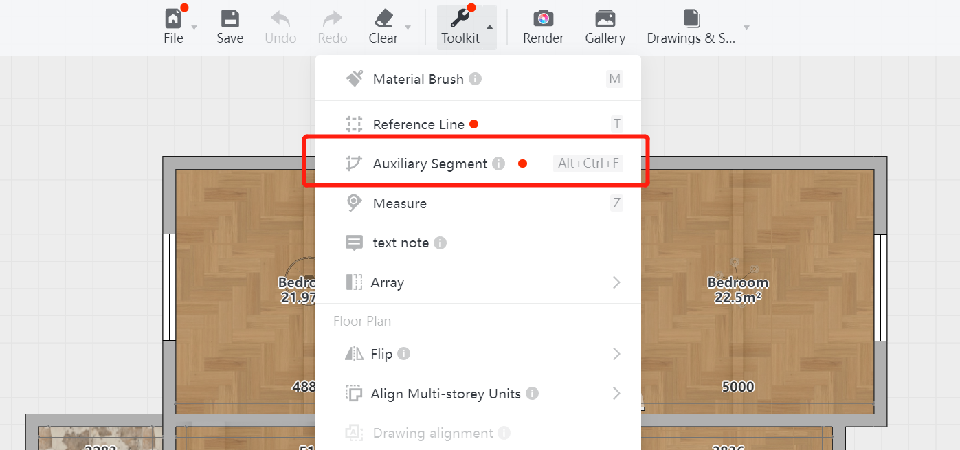 *The Auxiliary Line function is currently only available in 2D scenes (including 2D floor plans, 2D top views, and 2D elevation views).