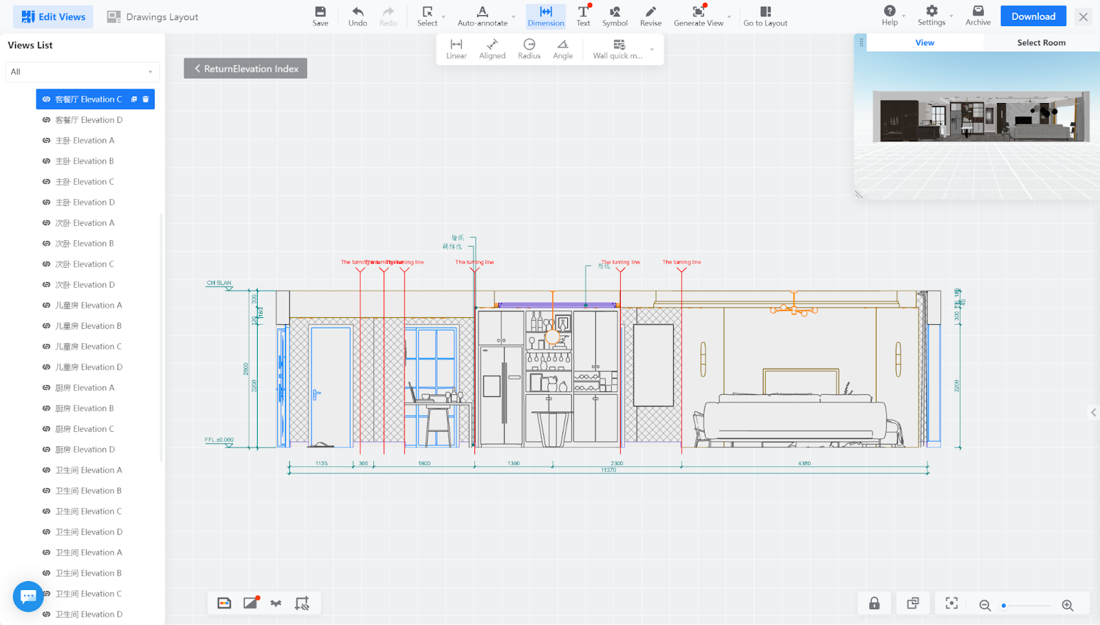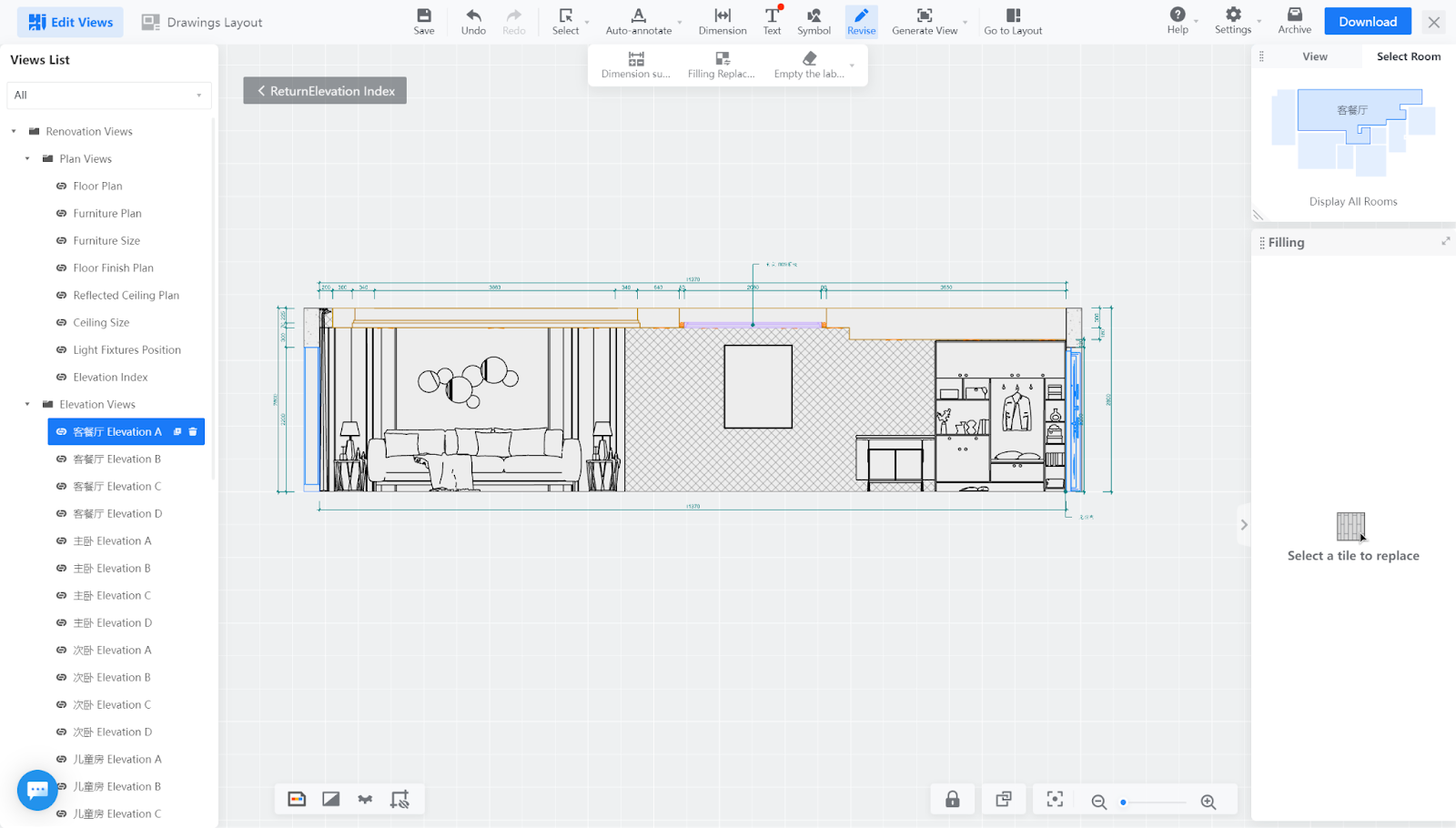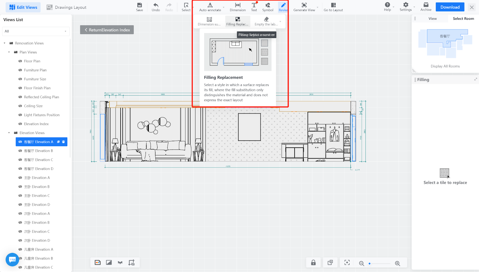 When the user selects the scope of the elevation, the content of the unwanted room will be filtered out if it is included in the selection area.