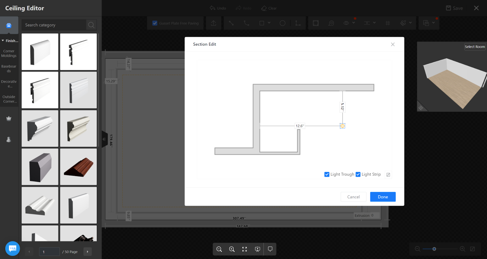 2. After entering section editing, you can drag the light strip to adjust its position or manually input the distance value between the light strip and modeling surface to change its position.