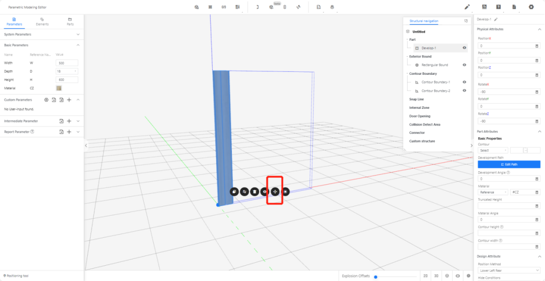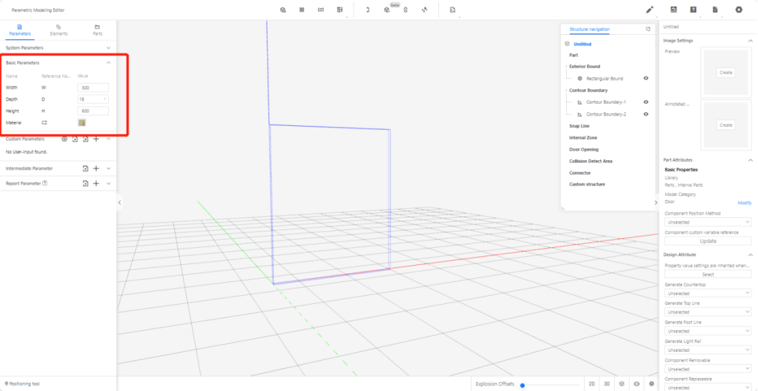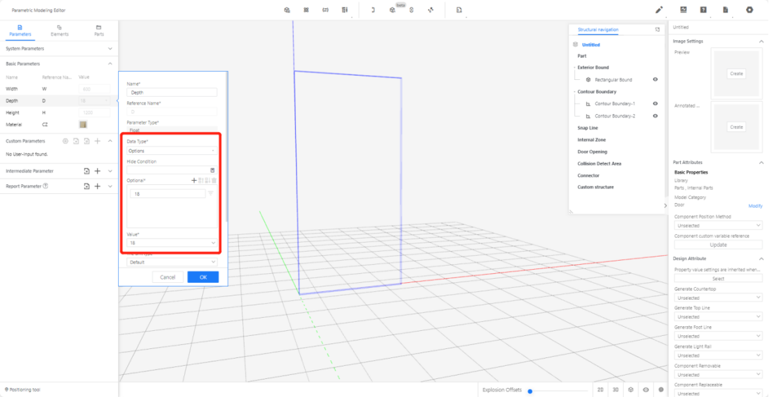 3.1.2 Depth (D) - Represents the size of the model panel in the Y-axis direction. Set the value type as a options (e.g., optional 18, current value: 18).