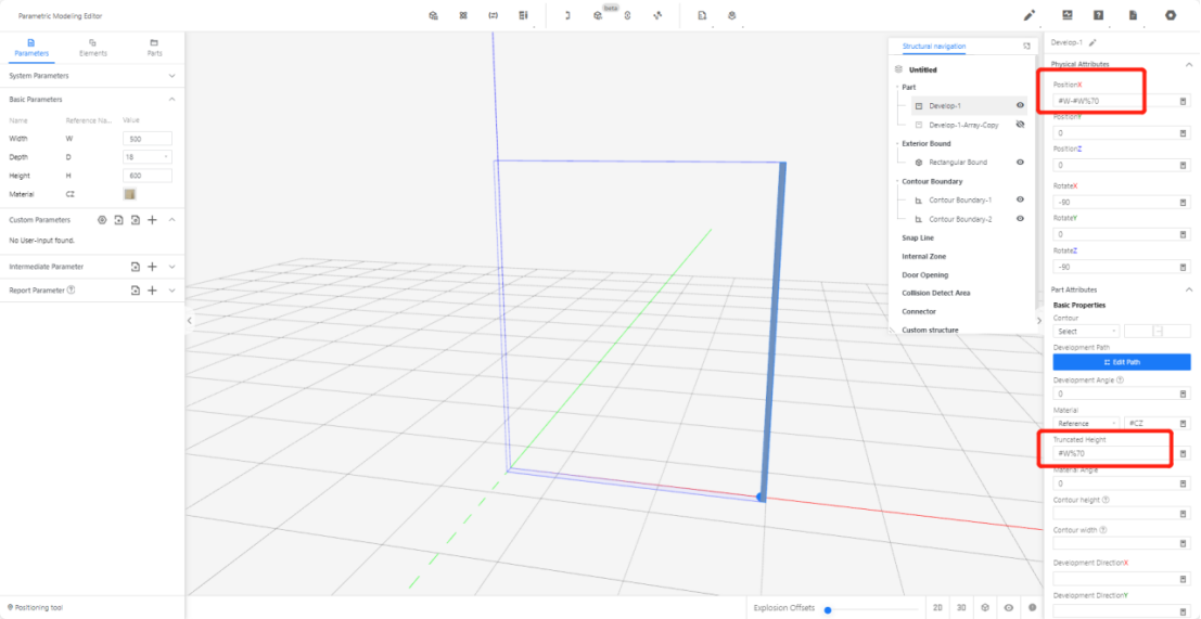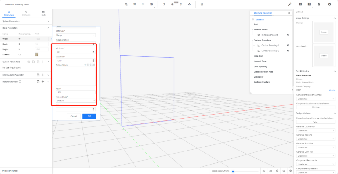 3.1.1 Width (W) - Represents the size of the model panel in the X-axis direction. Set the value type as a range (e.g., range 70-1200, current value: 500).