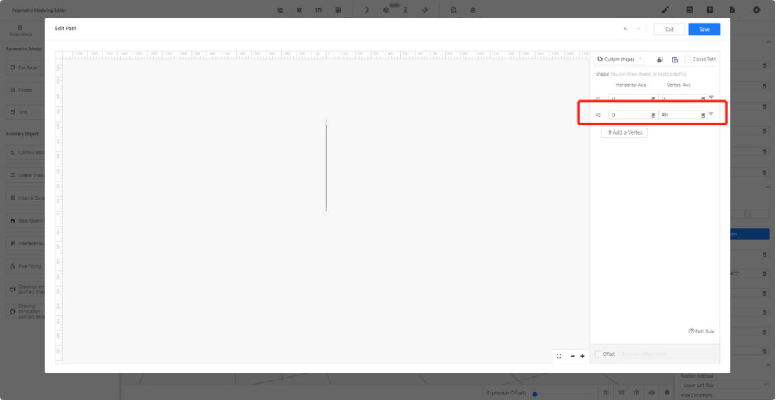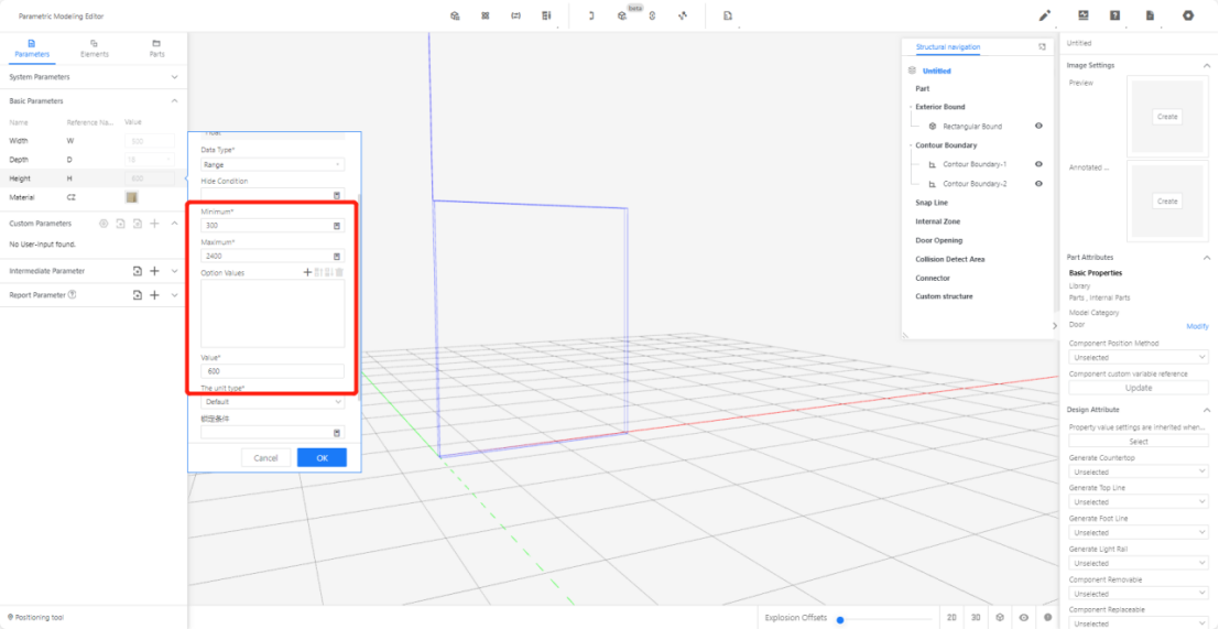 3.1.3 Height (H) - Represents the size of the model panel in the Z-axis direction. Set the value type as a range (e.g., range 300-2400, current value: 600).