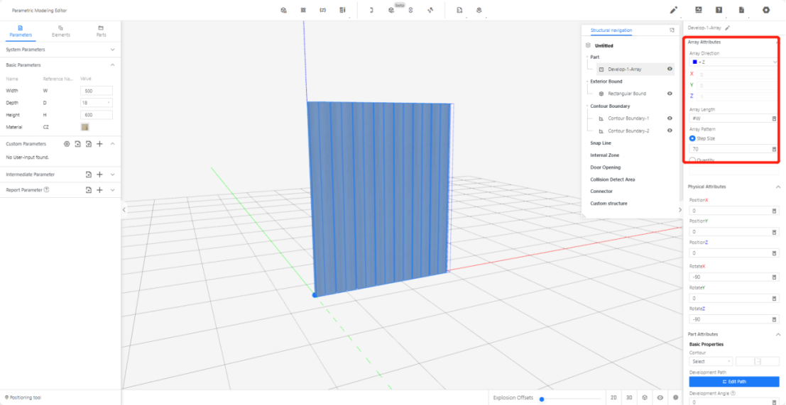 Set array attributes, Array direction: +Z; Array length: #W; step size:70