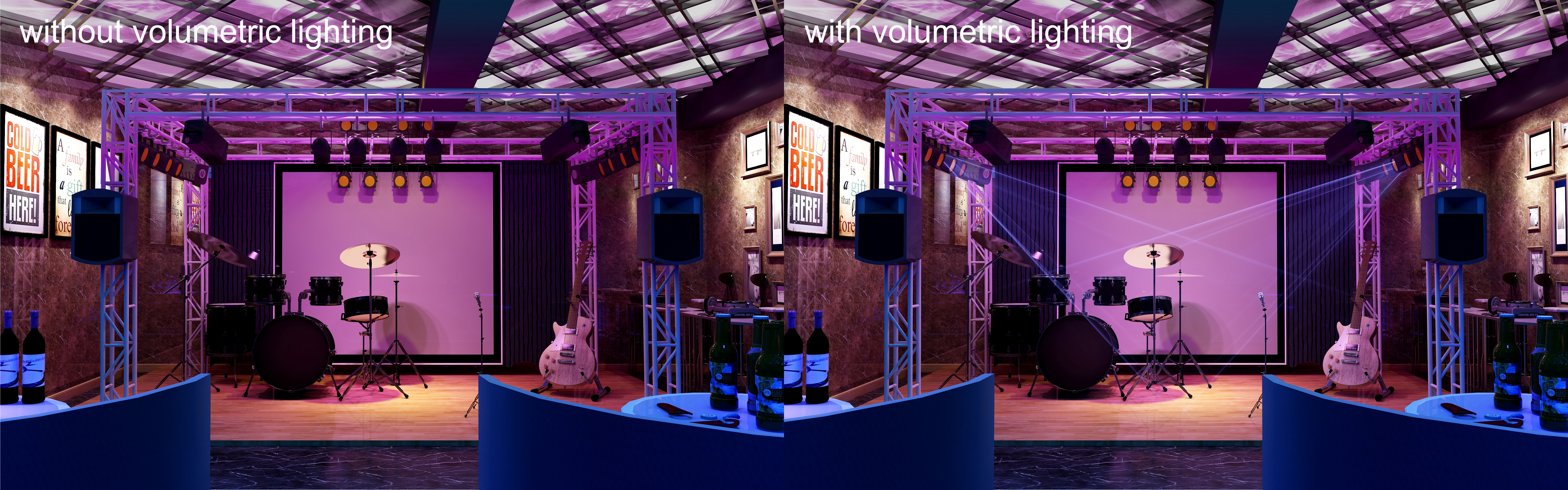 Volumetric light can enhance the atmosphere of public scenes such as the venue, improve the texture of the picture, thicker in air quality, show the dust more vividly, the renderings can be closer to reality and more lifelike.