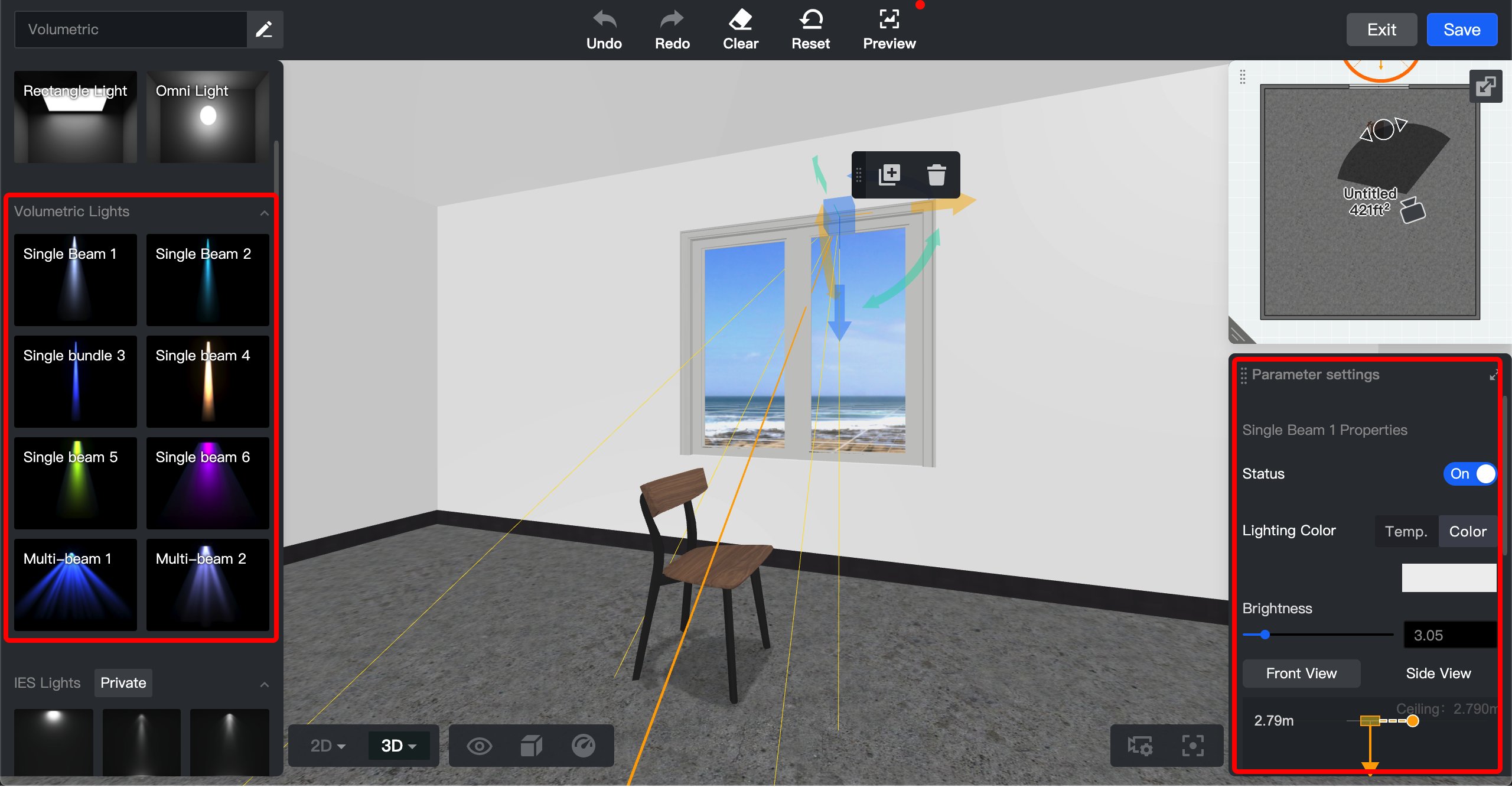 Coohom provides 8 kinds of volumetric lighting there, just select the one you need, drag and drop it into the design.