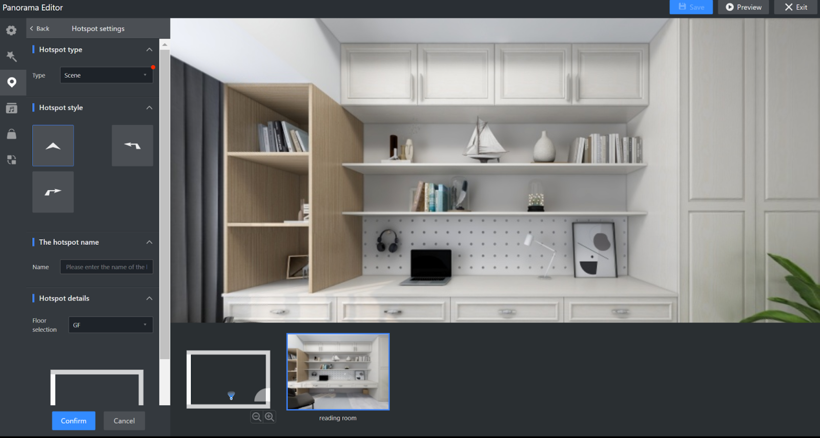 Scene hotspot: This hotspot only appears in 720 roaming. It allows configuration of hotspot styles that navigate between different panoramas in the 720 roaming.
