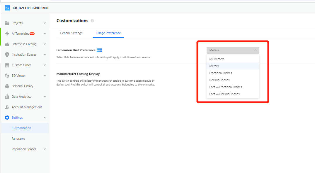 Users are now allowed to set the unit of measurement in the enterprise backend (creating textures, patterns, custom patterns, uploading furniture models). After setting the unit, both the tools and backend areas that display measurement units will synchronize and show the selected unit.