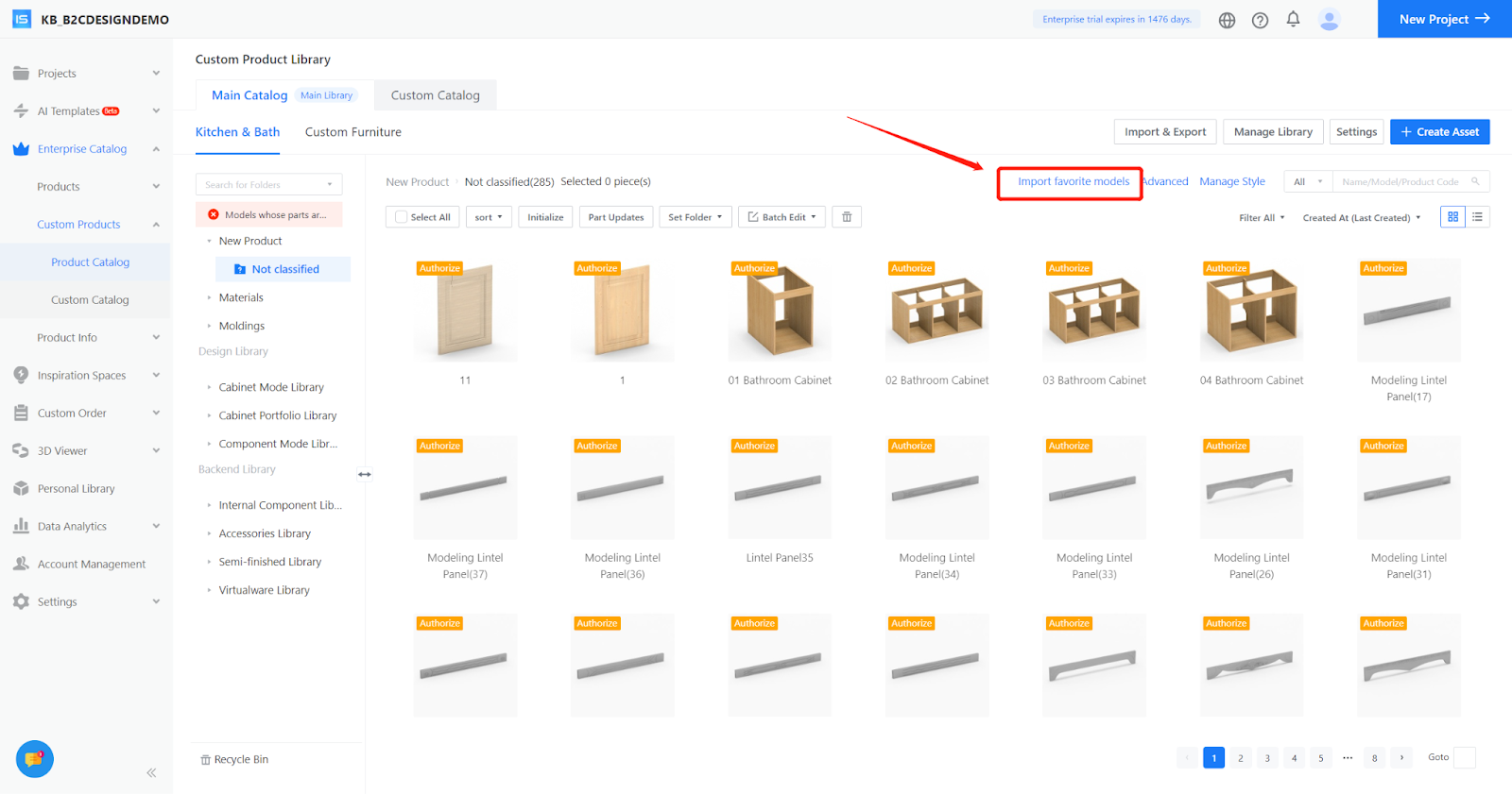 Step 2: In the custom products of the enterprise catalog, select 【Import favorite models】 and find the corresponding model