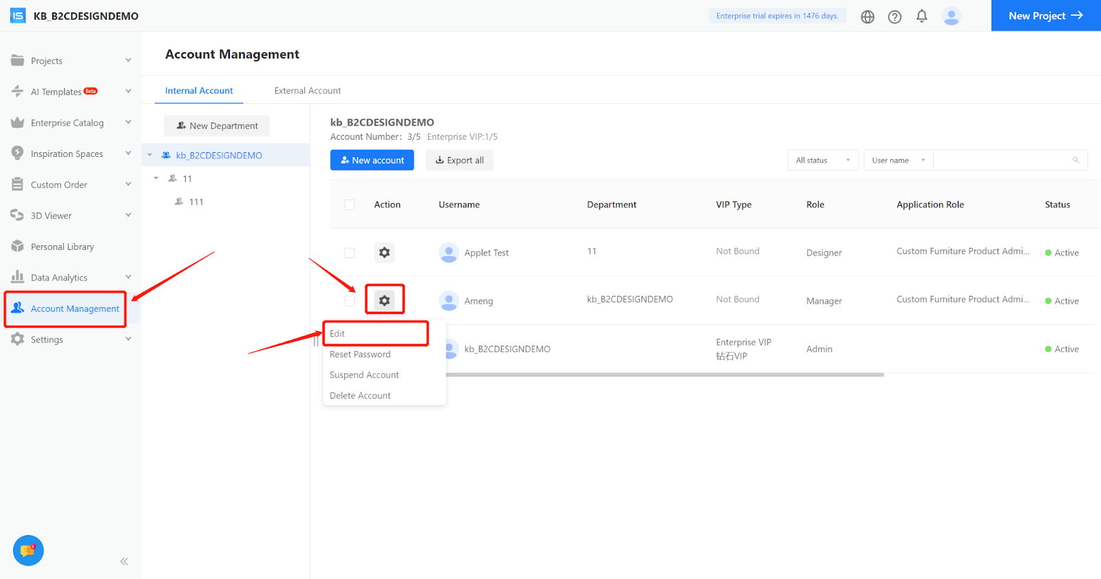 Step 1: Access the account management backend and select a sub-account. Click on the 【Edit】