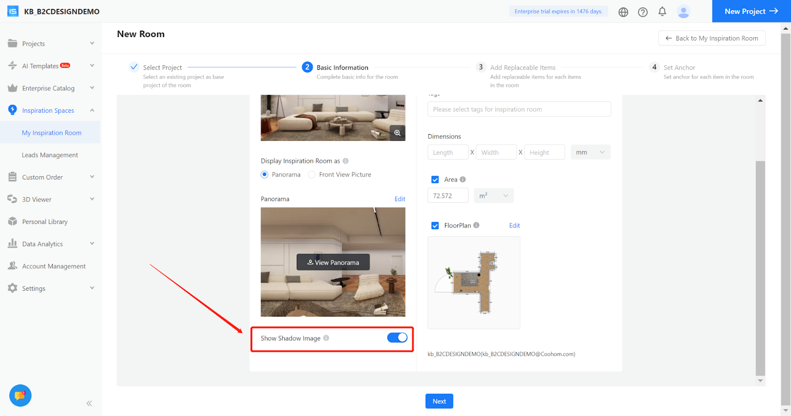 This switch controls whether the inspiration space displays a shadow image. Shadow images are suitable for showing loose furniture in a spacious environment, as they can enhance the realism of the models (such as bathtubs and sofas).