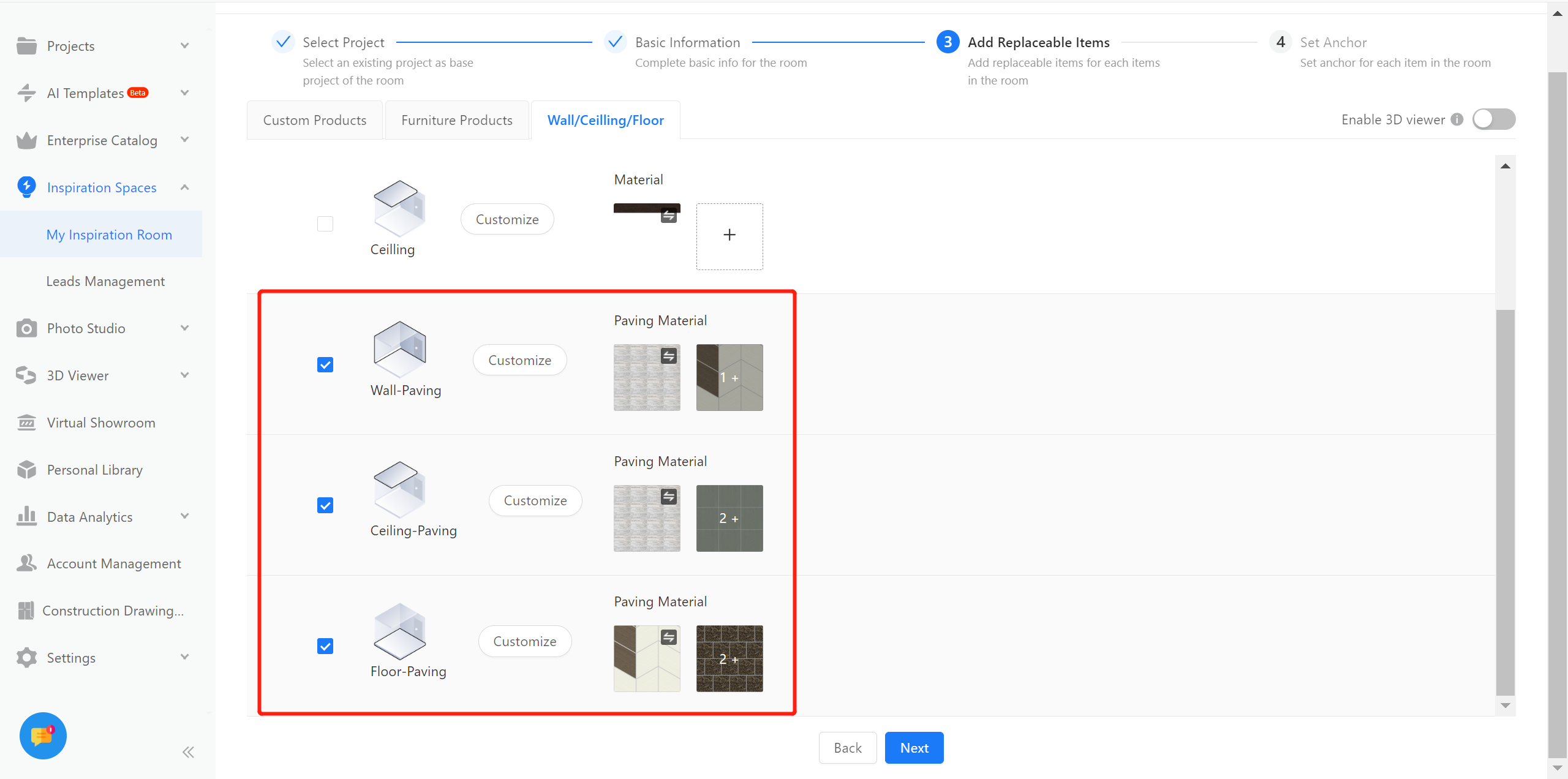 In the third step of creating the inspiration space, choose the replacement product - [Wall/Ceiling/Floor] module. If your original design uses paving products on these areas, these original pavings will be identified here.