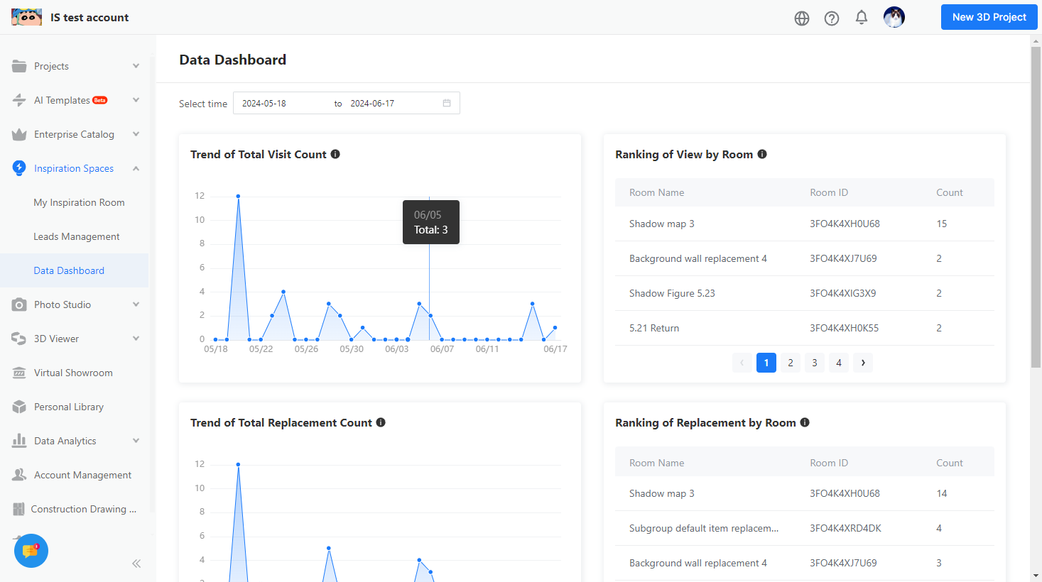 Through the Inspiration Space Dashboard, users can easily understand the visits and leads of the showroom, as well as stay informed about the most popular showrooms at any given time.