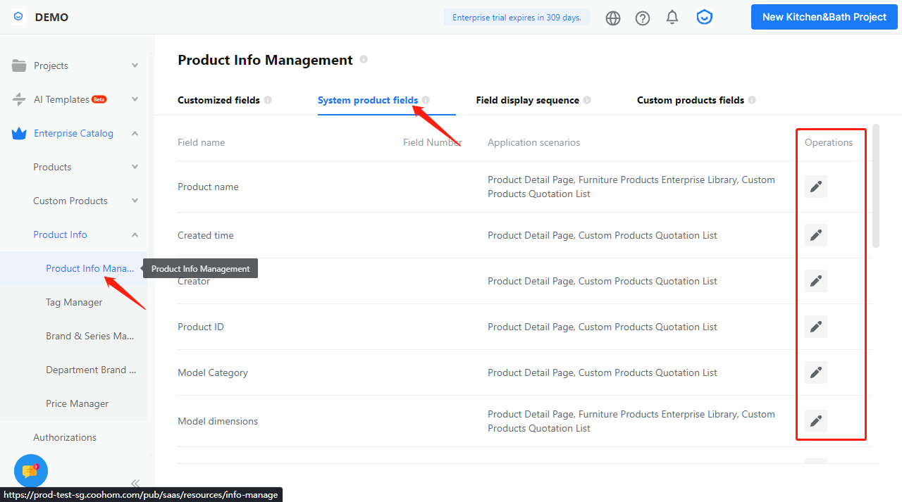First, navigate to the enterprise product library, select "Product infor management," then "Product Information Management," and choose "System product fields" Next, select the relevant product information, and click on "Edit."
