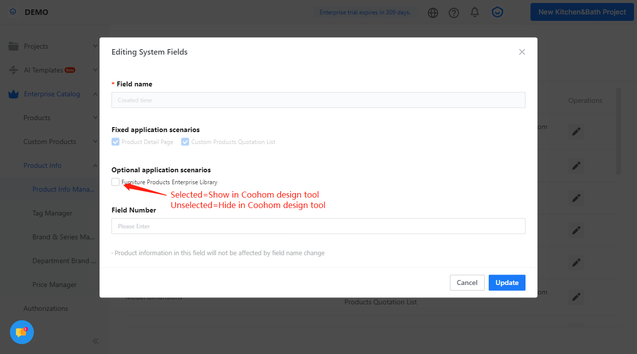 Now, enterprises can control which product fields to display or hide within the Coohom workspace, enabling them to showcase these fields within the design tool.