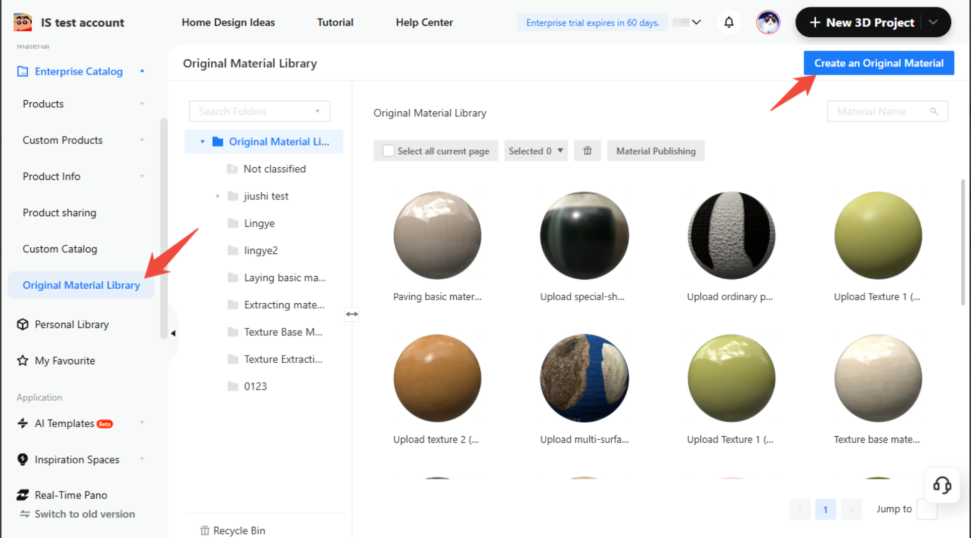 Enter the Original Material Catalog and click on [Create Original Material] to access the material creation tool.
