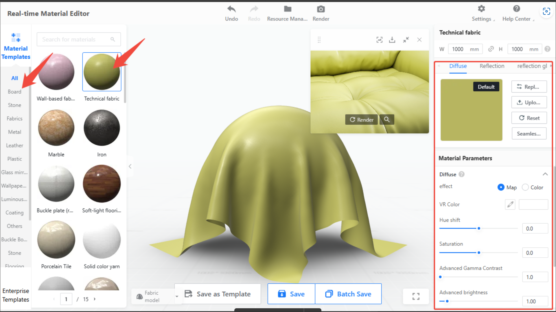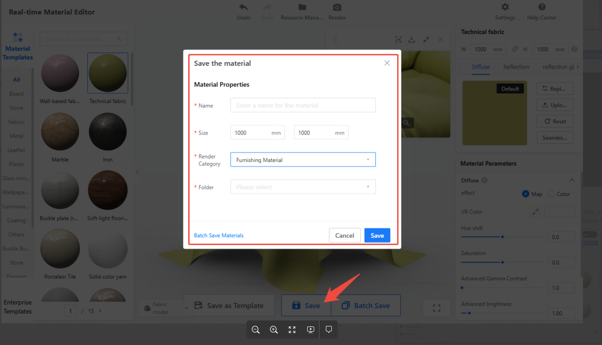 First, select the type of material from the left panel. Then adjust the material’s texture and color properties based on specific requirements in the right panel.
