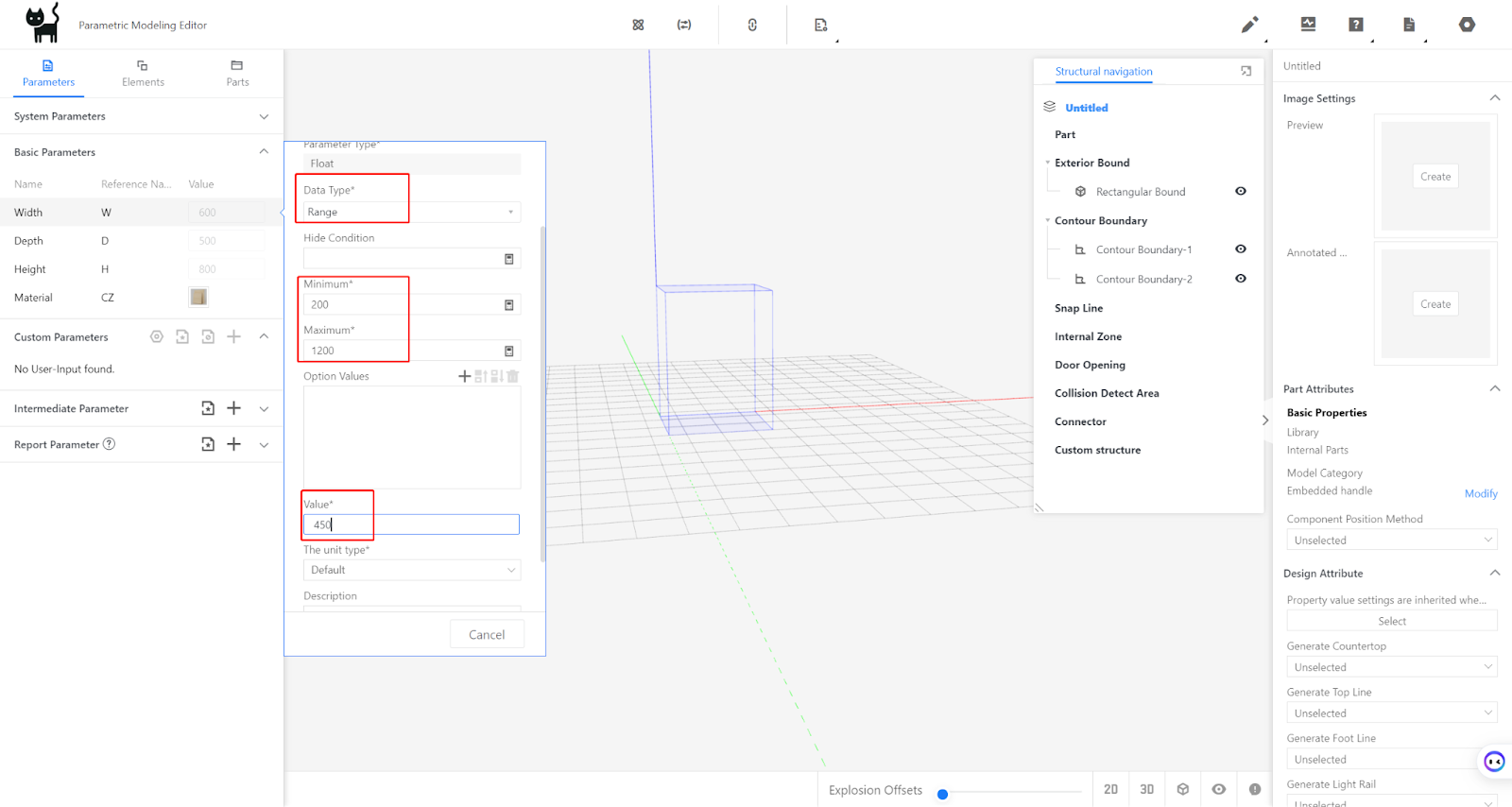 Width (W) - represents the size of the handle model in the X-axis direction. The value type can be set as optional or within a range (e.g., range is 200-1200, current value is 450) depending on the requirement.