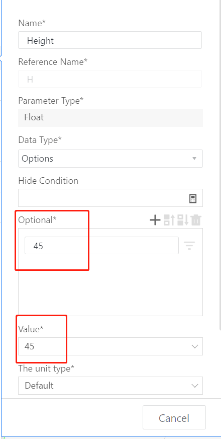 Create a new embedded handle and set the relevant parameters (same steps as above), but change parameter H to an optional value; 45.