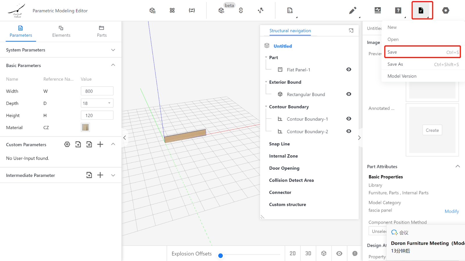 Click the left mouse button to select the flat panel component, and in the top-right corner, the dimension property setting option for flat panel component-1 appears.