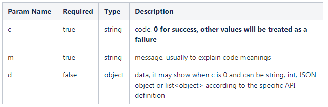 Typically, HTTP response status code is 200.Specific business success or exceptions are represented by c field in the outer unified data structure.0 means success, other values mean exceptions.But it does not exclude the use of HTTP status codes in special cases, such as server-level exceptions, some framework errors and undefined exceptions.When dealing with the response result, you should judge the validity of the result by the priority order of HTTP status > c value.All HTTP status non-200 requests are abnormal, so are c value != “0” results.