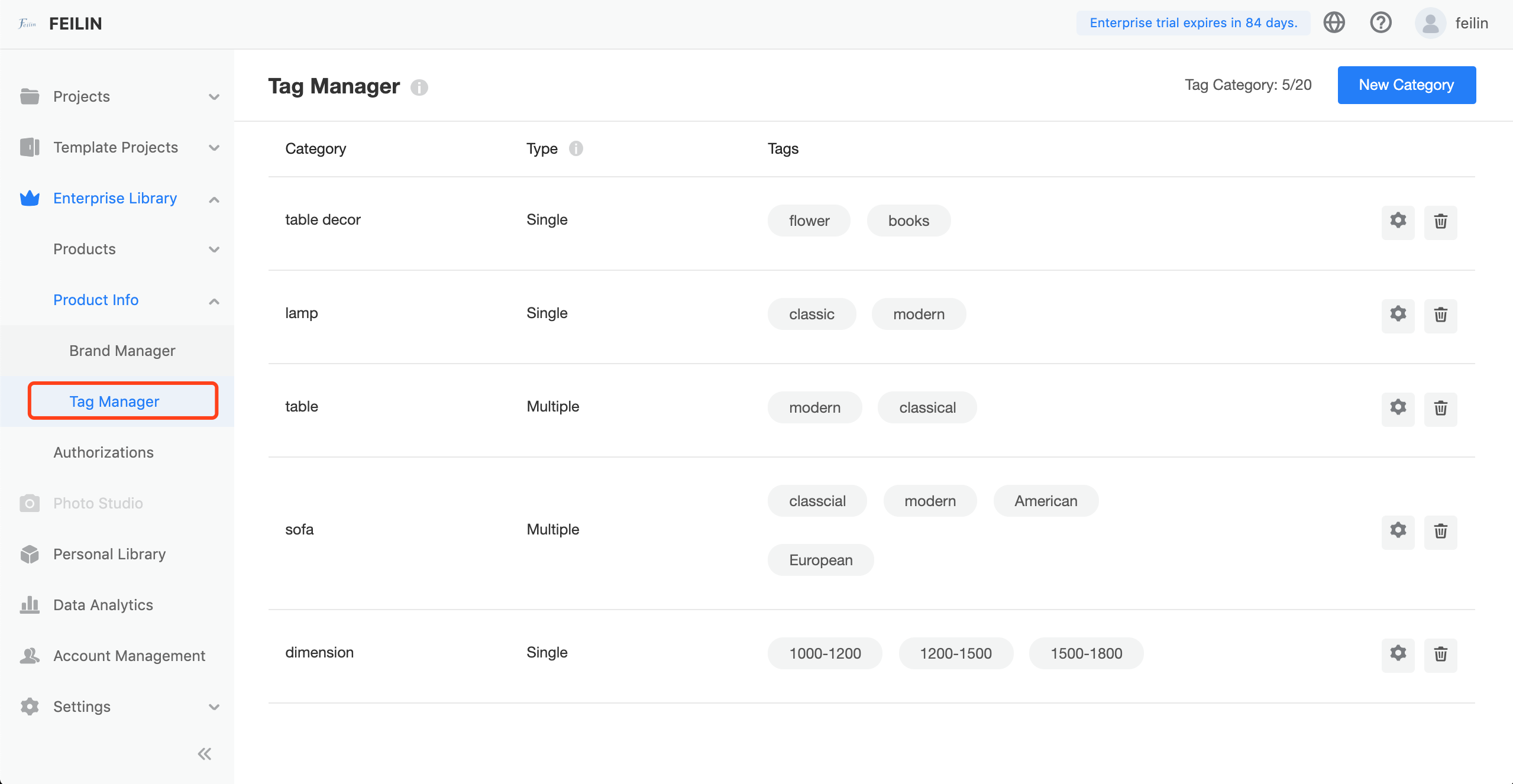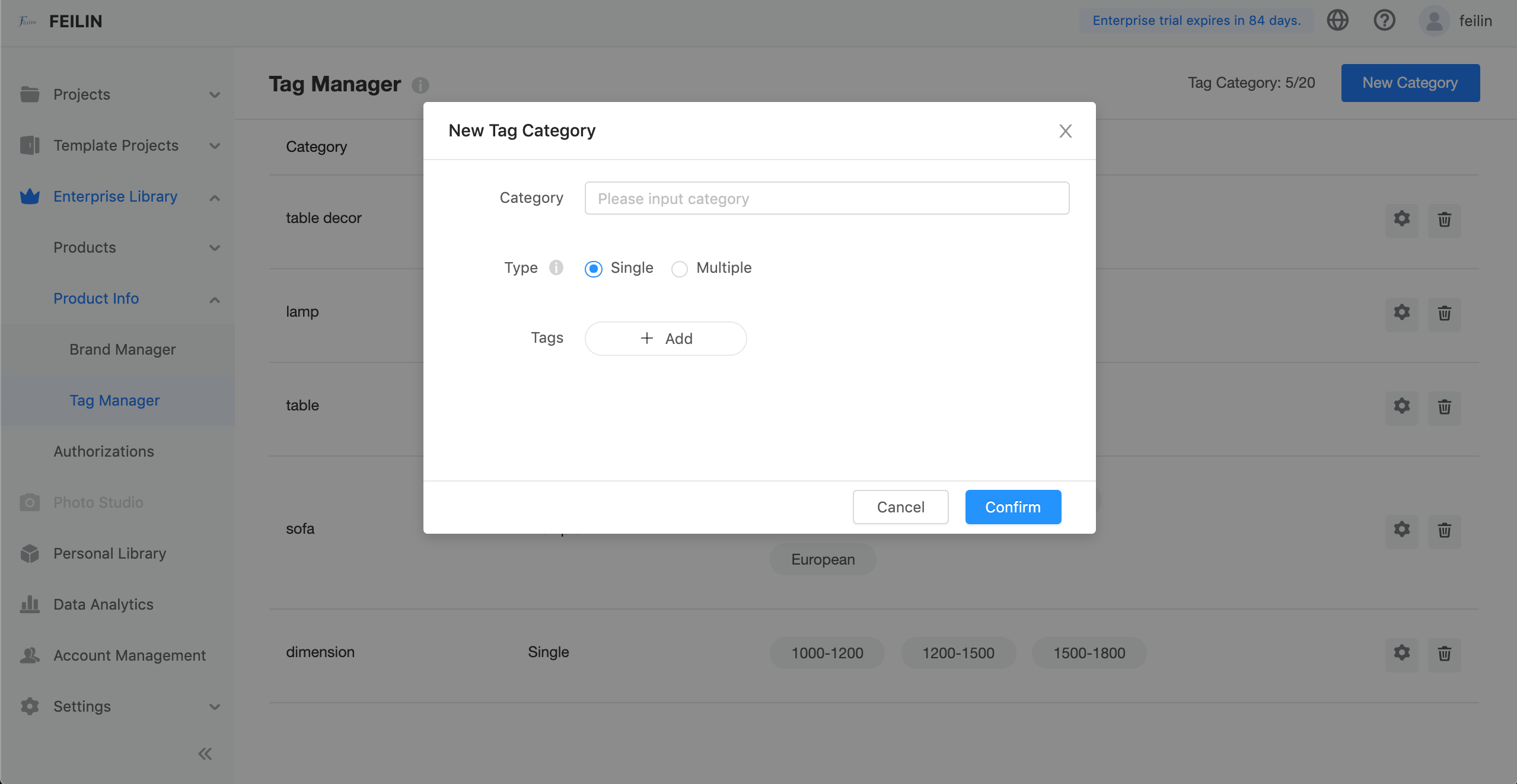 Create Category > select Type > add Tags > Confirm Single Type means only one tag in this category can be selected for products. Multiple Type means you can select some of the tags for one product.