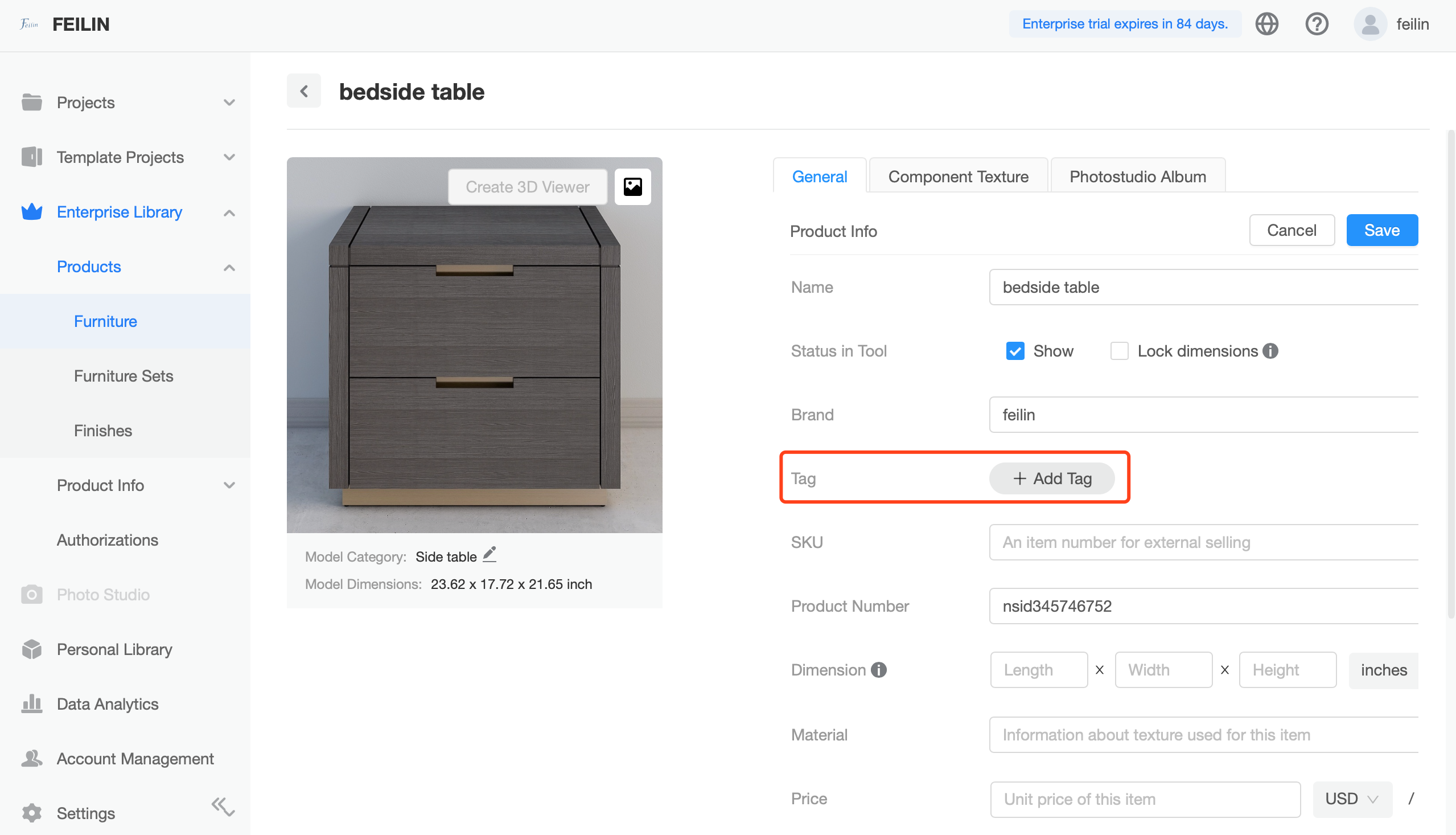 Go to Enterprise Library > Products > Furniture/FinishesSelect one product to edit its information.Select Tags as you created before.