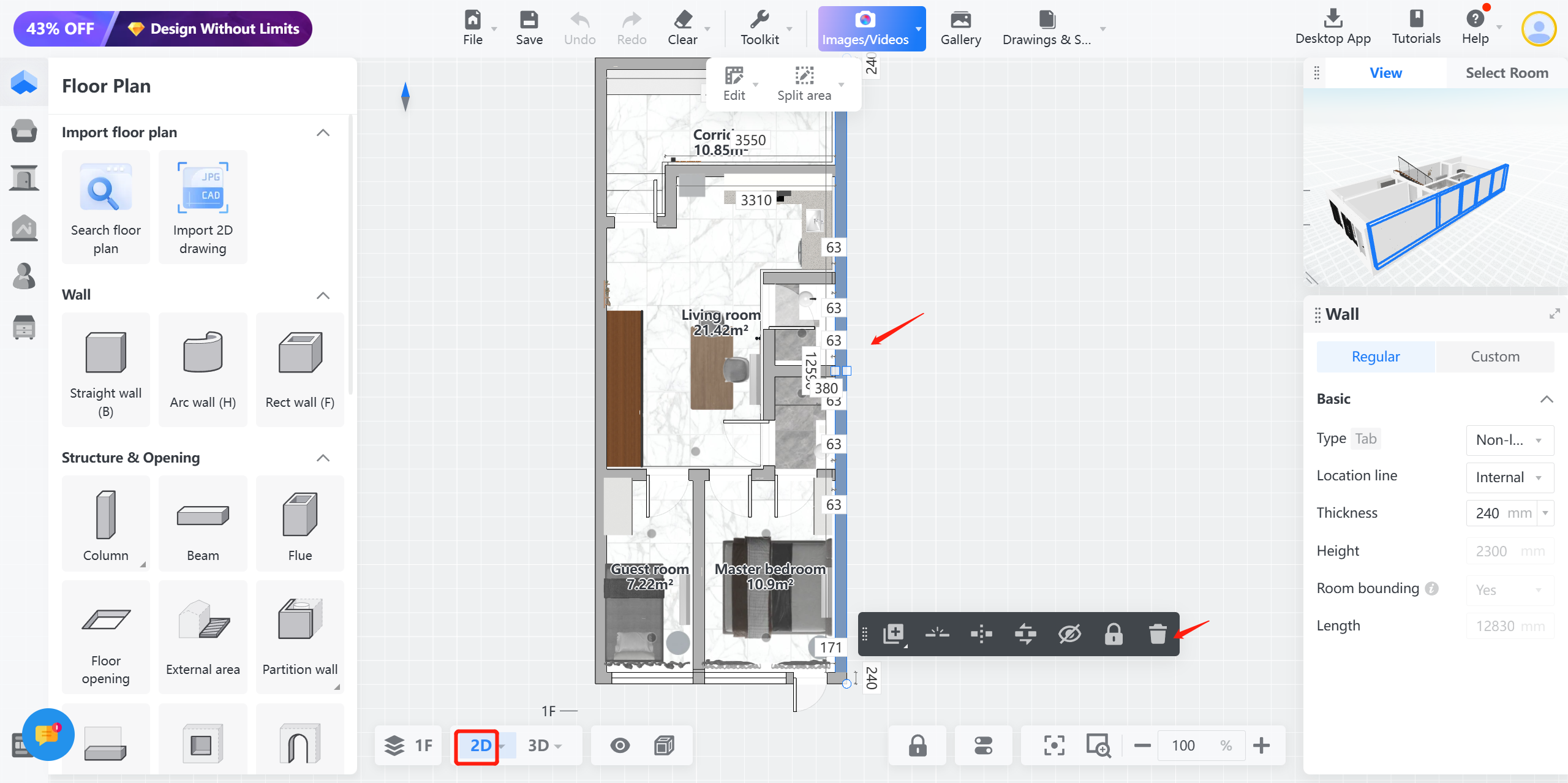 Once you are in 2D view, simply click on the wall that you want to delete. After clicking, wait for the toolbar to appear. This toolbar contains various editing options, including the delete function.