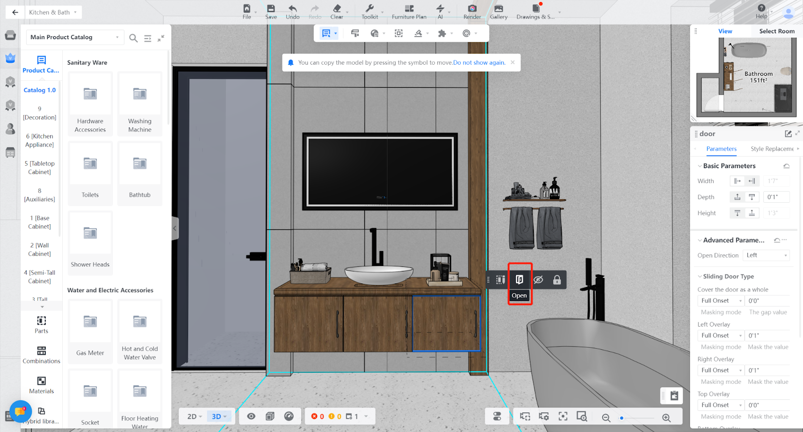 Step 3: The open/close door function not only allows you to open all cabinet doors with one click, but you can also open individual cabinet doors. Double-click on a specific cabinet door panel and then select the "Open" button to open it.