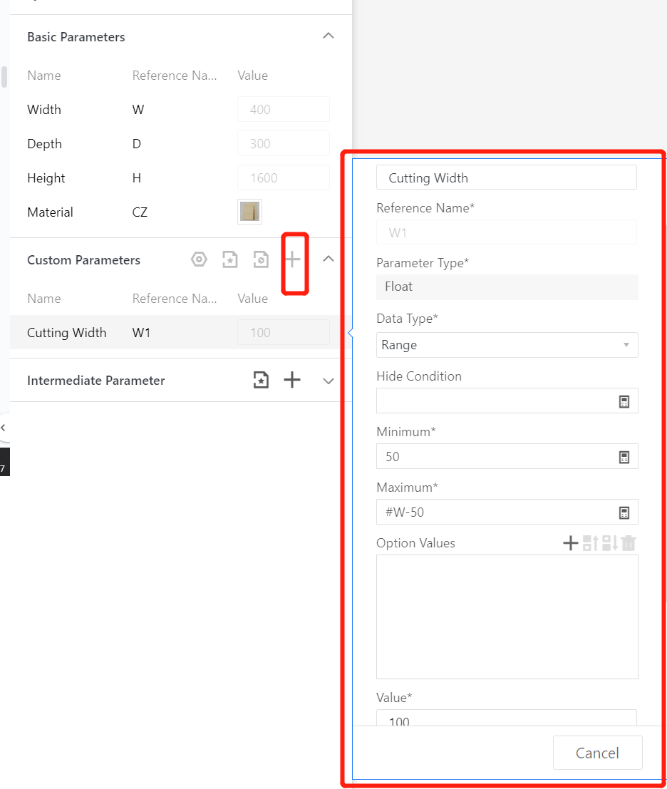 Width (W) - Represents the dimension of the model board in the X-axis direction, i.e., the width of the curved cabinet. The value type is set as optional (e.g., 300, 350, ..., 1000, current value 900) or as an interval (e.g., interval 200-1000, current value 400).
