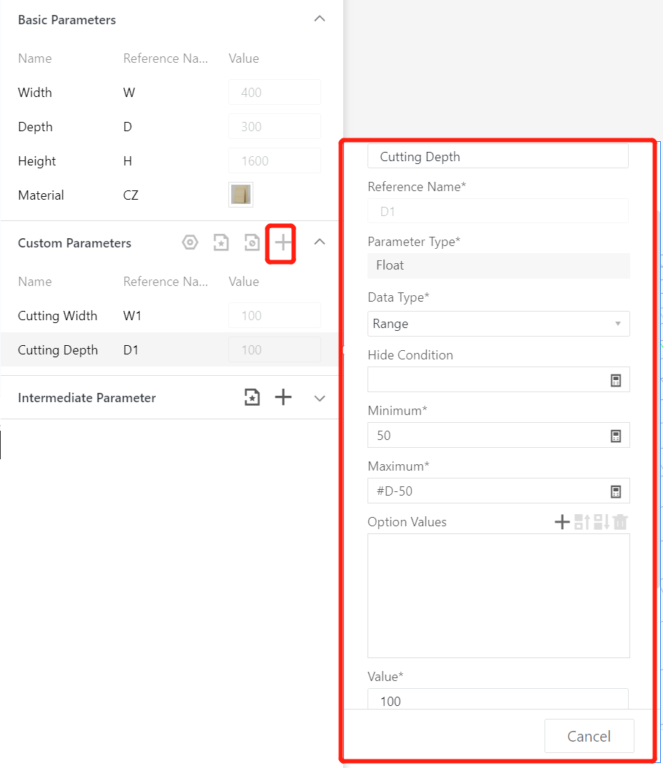1.2 Depth (D) - Represents the dimension of the model in the Y-axis direction. The value type is set as optional (e.g., 300, 350, ..., 1000, current value 900) or as an interval (e.g., interval 200-1000, current value 300).