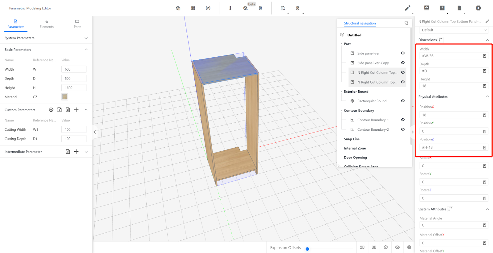 Edit the contour line: point 1 (0,0), point 2 (#W-#W1,0), point 3 (#W-#W1,-#D1), point 4 (#W,-#D1), point 5 (#W,-#D), point 6 (0,-#D) - Save.
