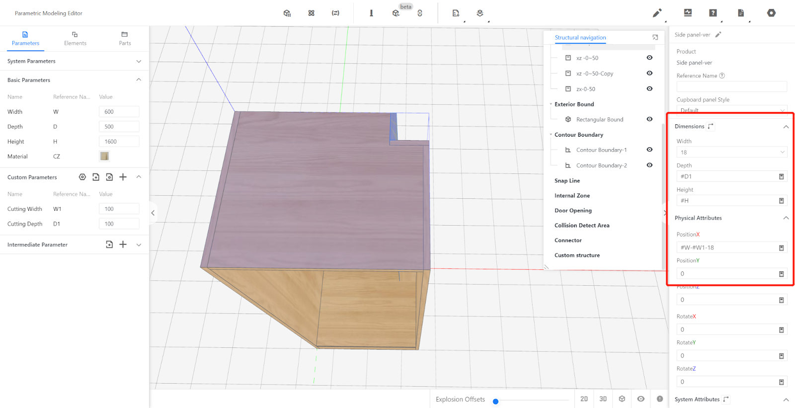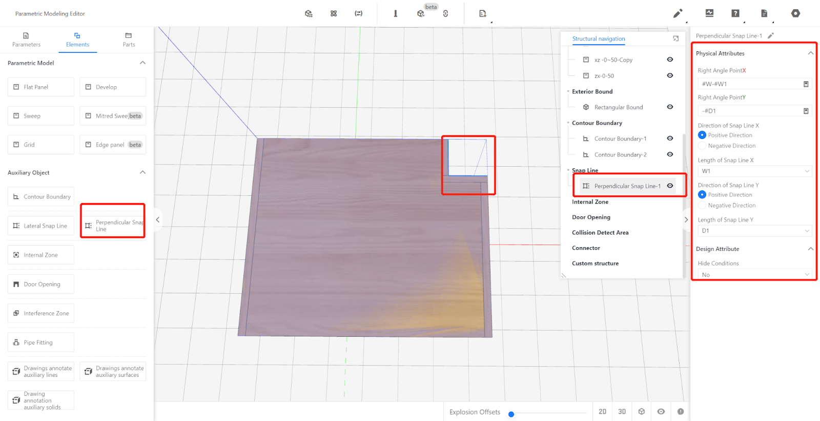 The right-angled snap line is used to adapt the size of the model to the space in the front-end tool. It needs to be called and edited in the Elements.