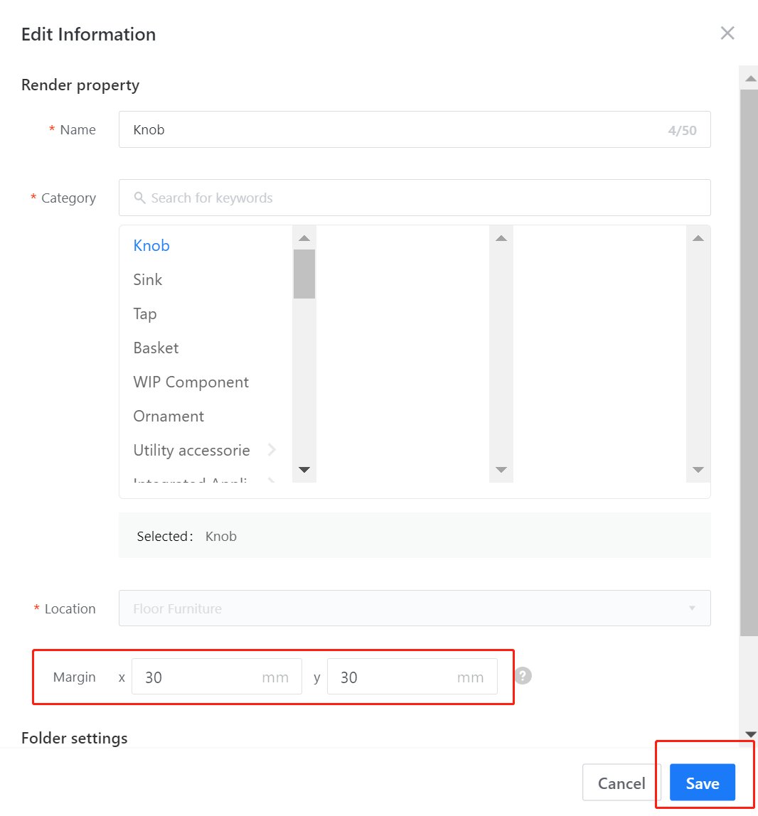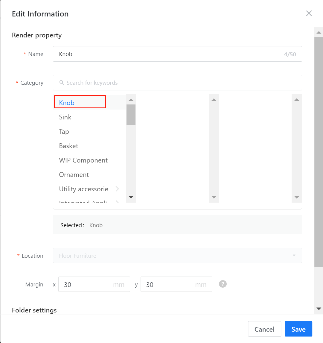 Once the category is determined, you can adjust the default distance parameter of the handle. In this case, the system will default to X: 30 and Y: 30 as the distance from the handle model's edge to the edge of the door panel. These values can be modified later for further use.