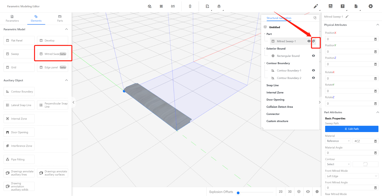 Note: The Boolean modeling block only has hollowing out effect on oblique swept entities. If the non-oblique swept model entity overlaps with the Boolean modeling block, there will be no hollowing out effect.