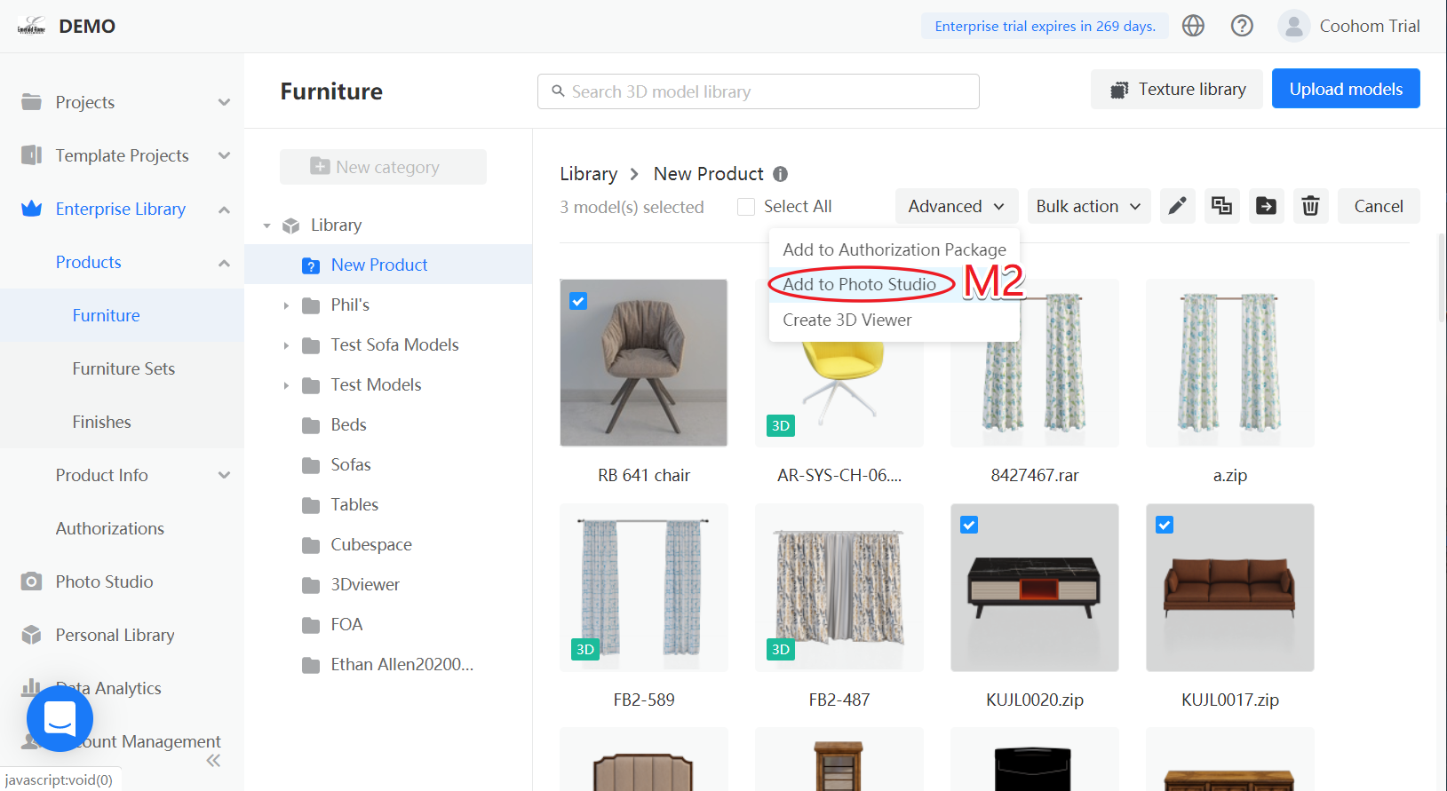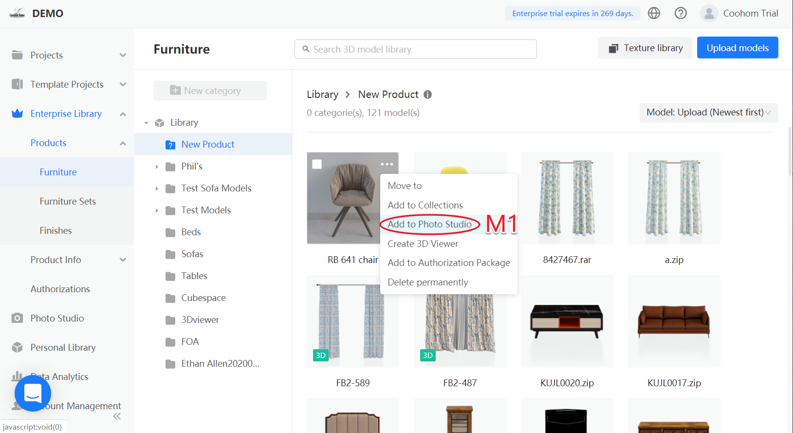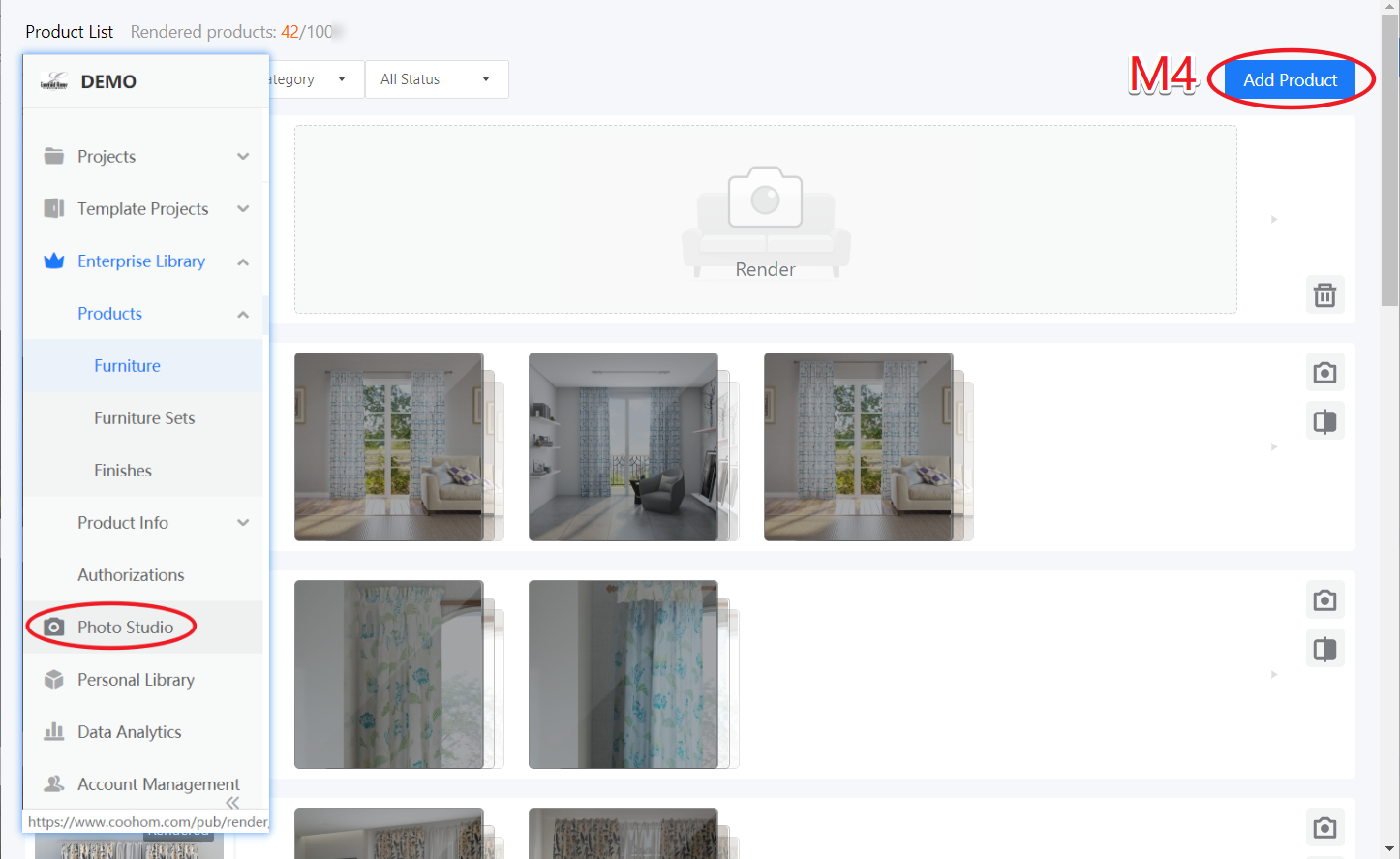 M4: Go to the Photo Studio on the left, click Add Product to enter the furniture list, and use the above 1-3 method to add the model to the photo studio.
