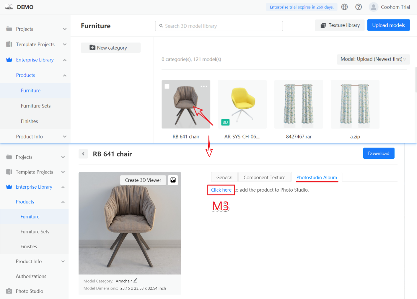M3: Click the model to enter the model details page, Photostudio Album > Click here to add the product to Photo Studio.