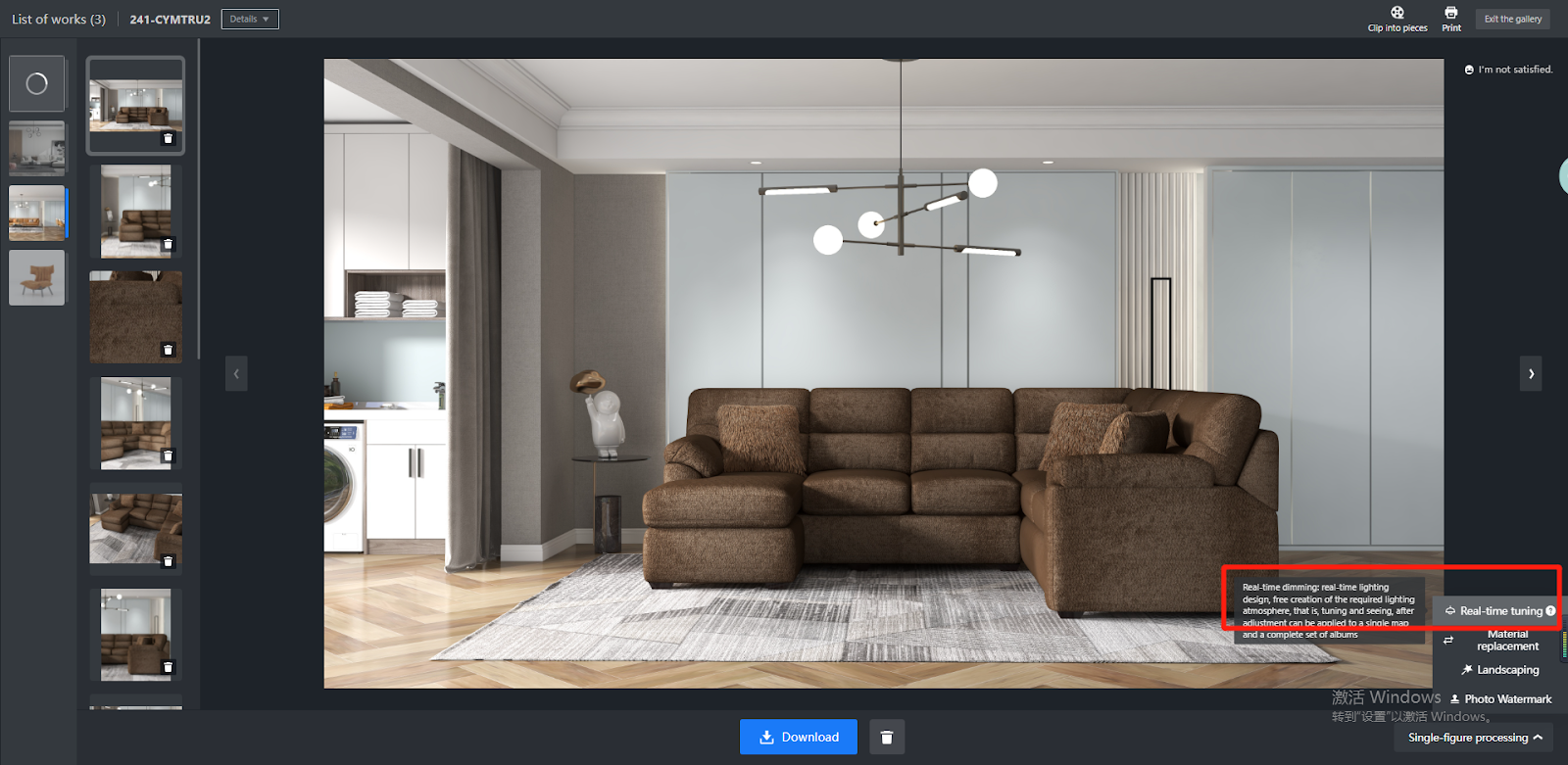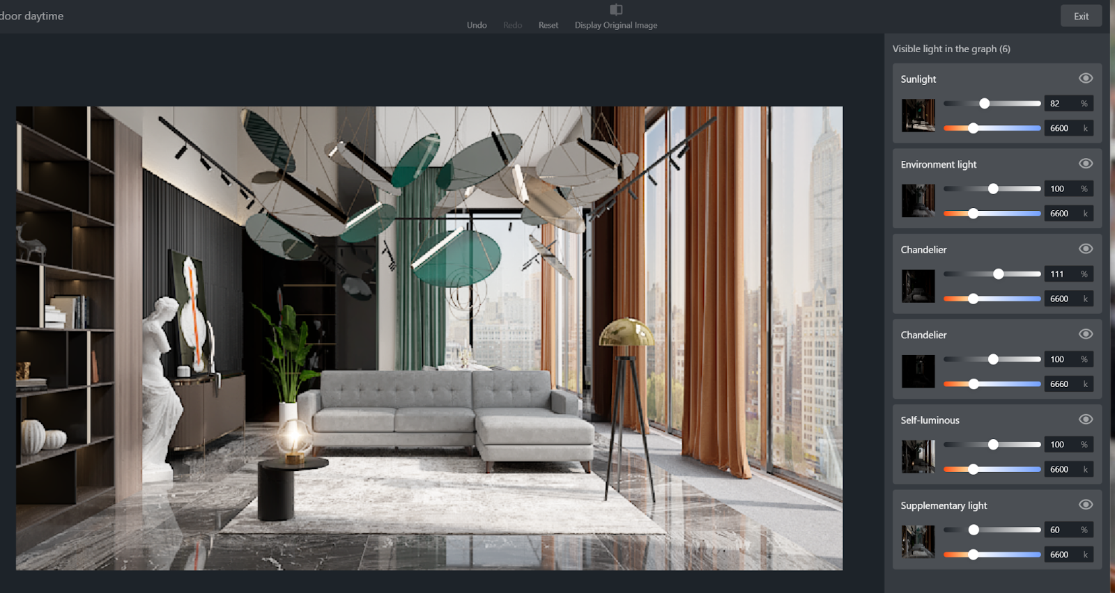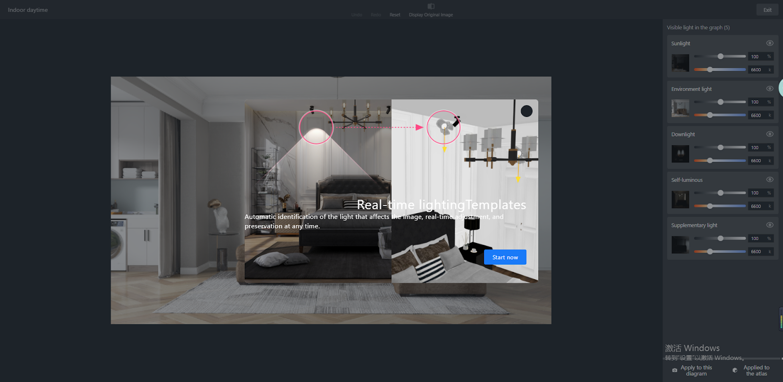 You can then adjust various types of visible light of the room scene through the slider bars. There are two parameters for each type: one is brightness, measured in percentage (%), and the other is light color temperature, measured in Kelvin (k).