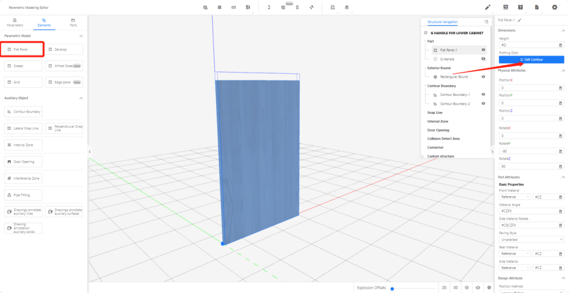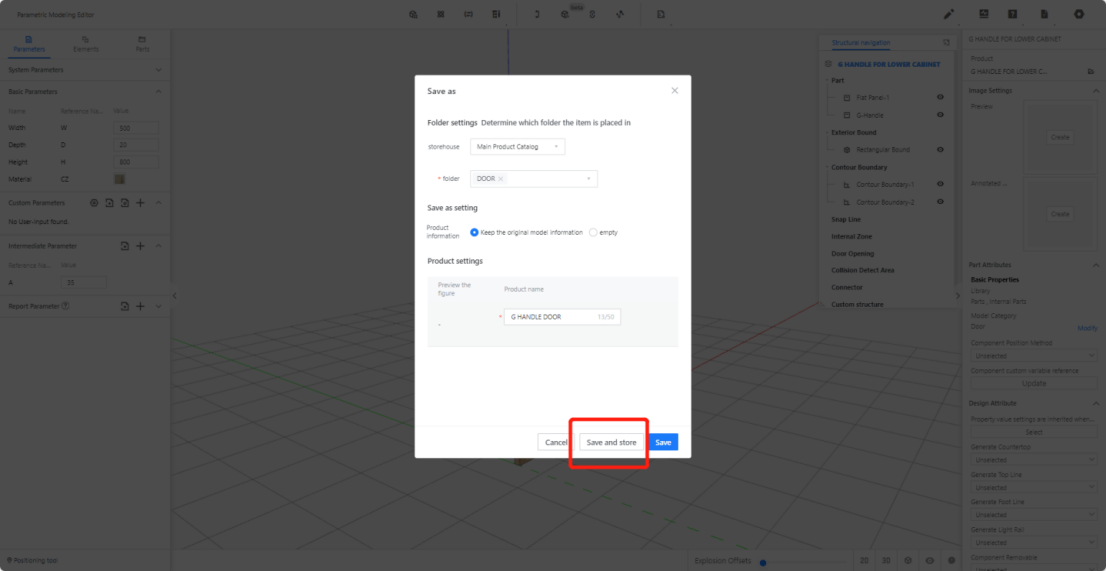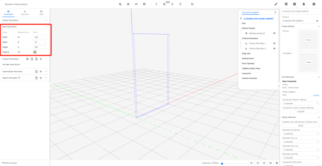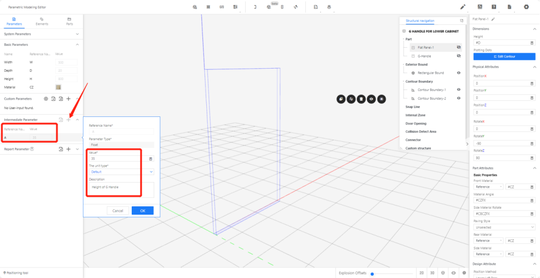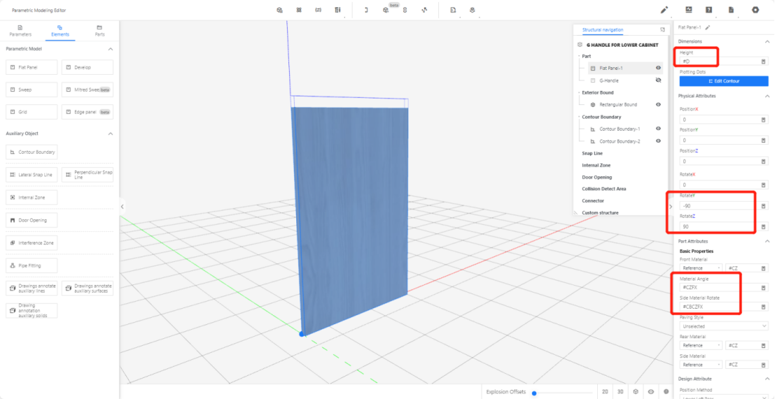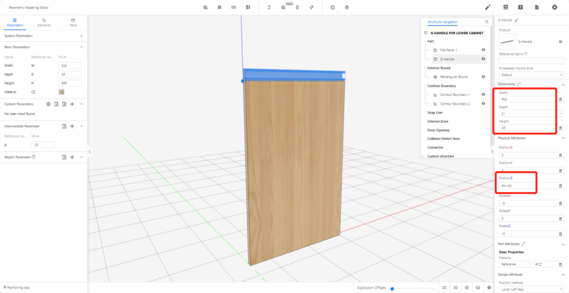 4.2 Import G handle from parts library and set its dimensions,width:#W,depth: 21(default),height:45(added the part inserted into the door panel).Position Z: #H-45.