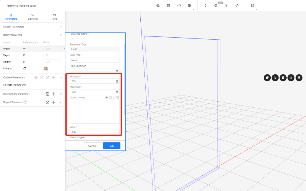 3.1.1 Width (W) - Represents the size of the model panel in the X-axis direction. Set the value type as a range (e.g., range 200-600, current value: 500).
