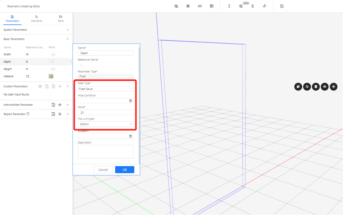 3.1.2 Depth (D) - Represents the size of the model panel in the Y-axis direction. Set the value type as fixed value (e.g., fixed value 20).