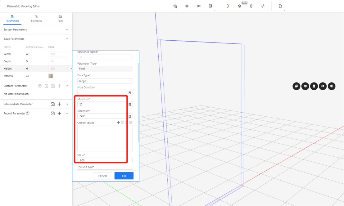 3.1.3 Height (H) - Represents the size of the model panel in the Z-axis direction. Set the value type as a range (e.g., range 20-2400, current value: 800).