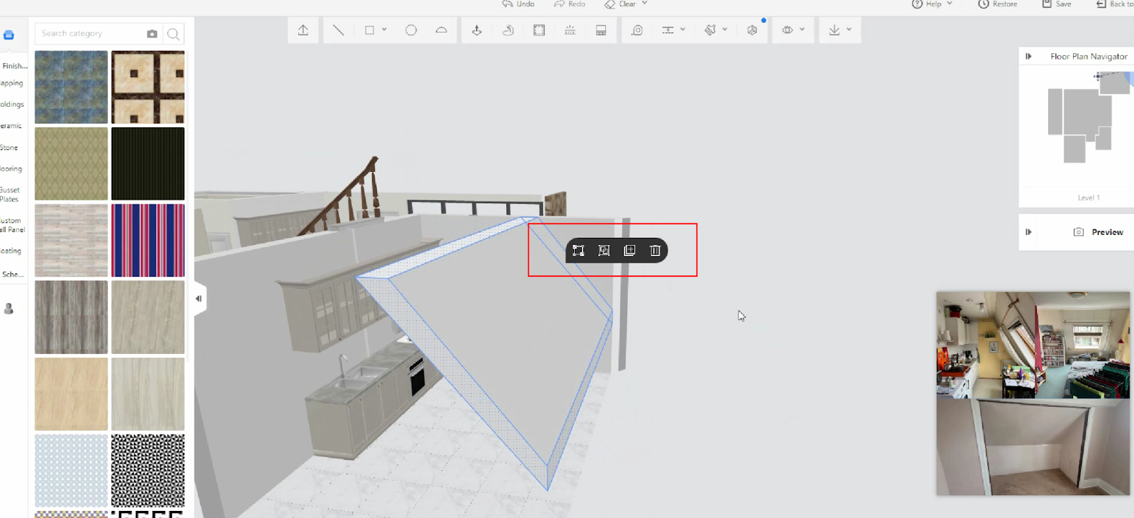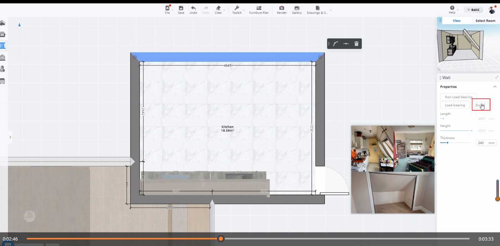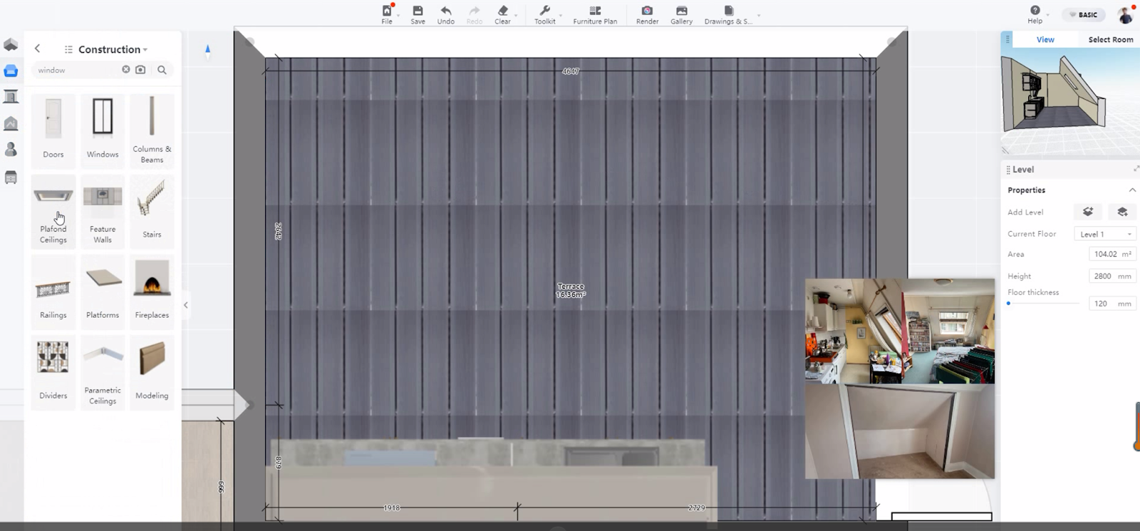 7. Go back to the 2D floor plan interface to click the wall under the modeling to make it dwarf and customize the room name into terrace so that there will be no ceiling.