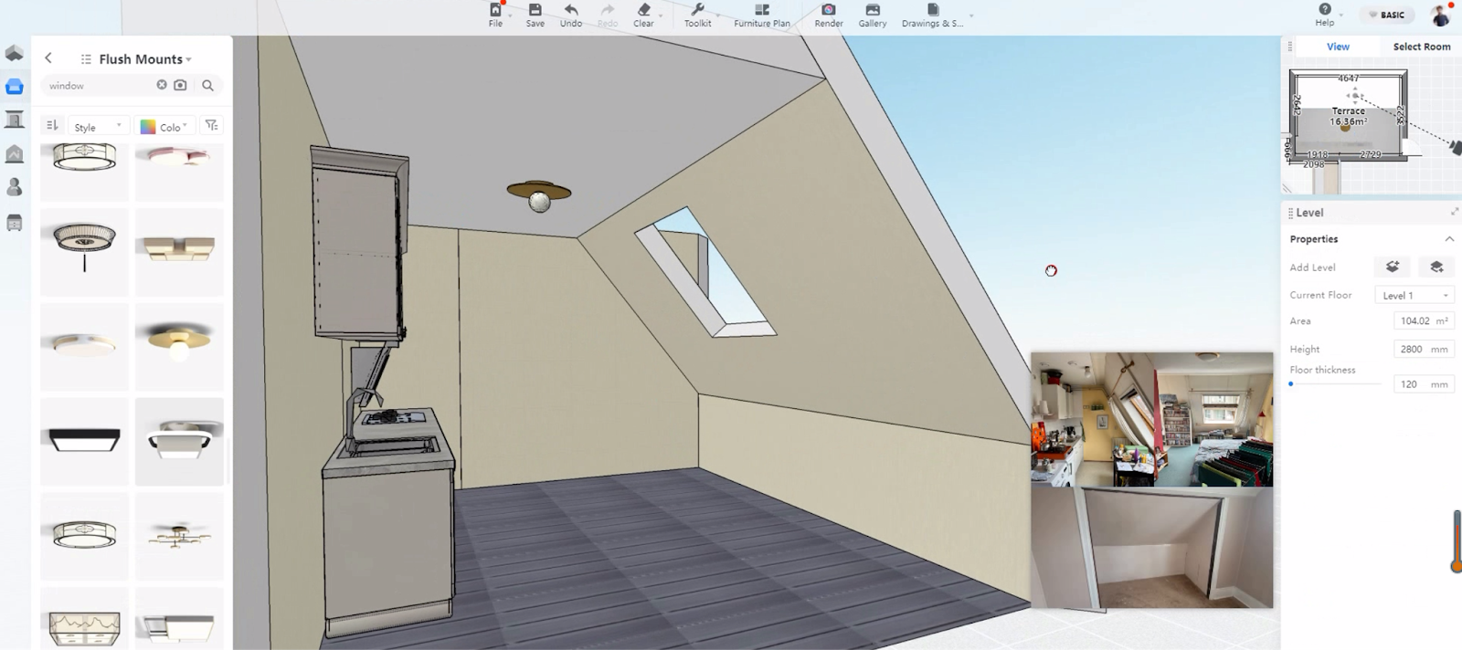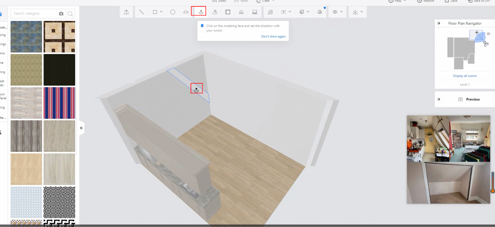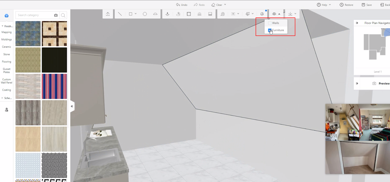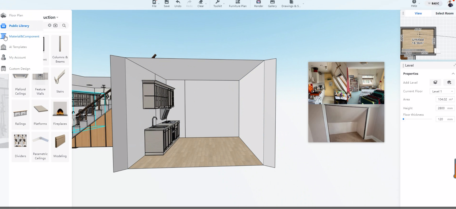7. Go back to the 2D floor plan interface to click the wall under the modeling to make it dwarf and customize the room name into terrace so that there will be no ceiling.