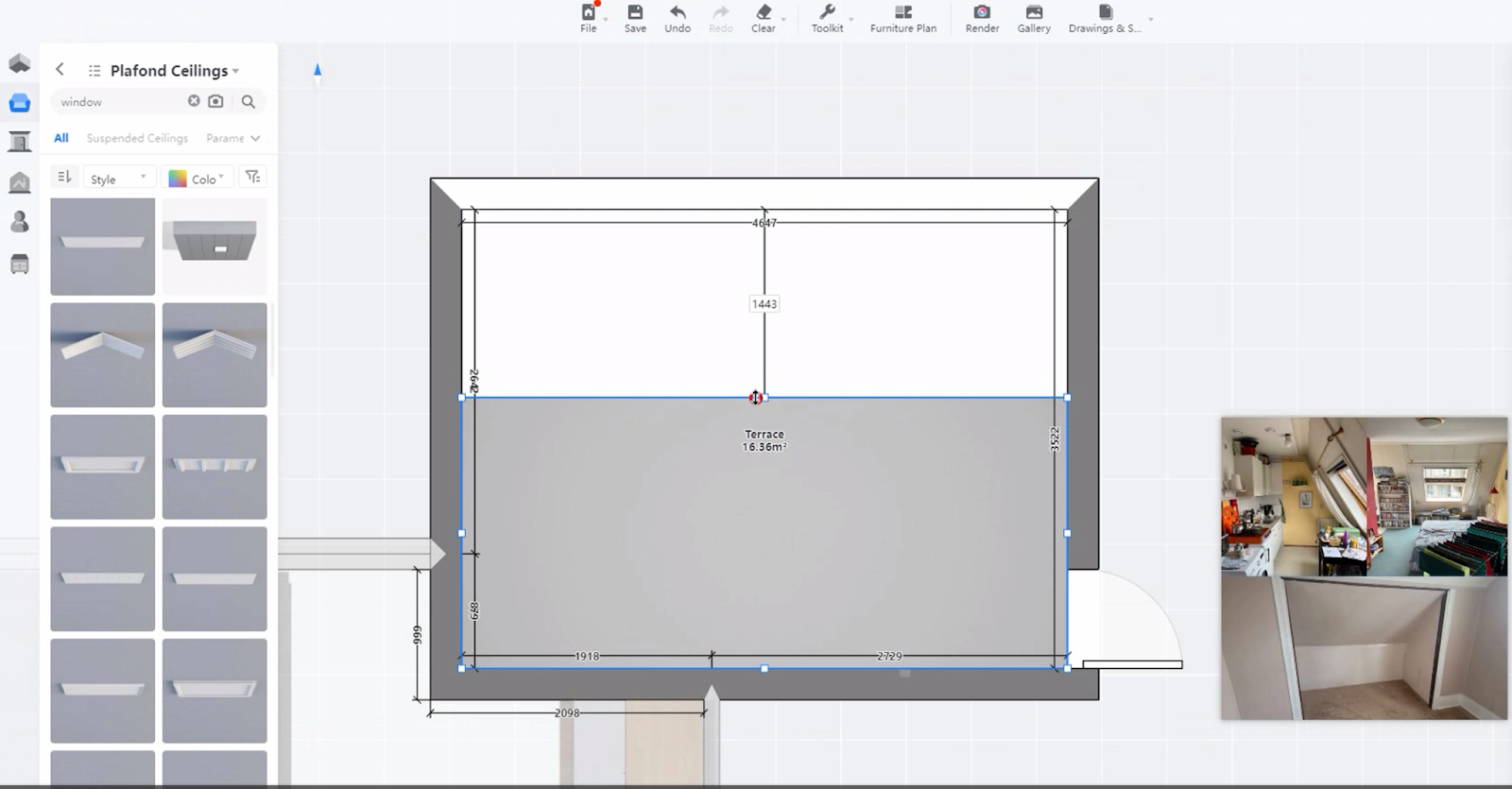 8. Choose a ceiling in the Public library>Construction>Plafond Ceilings to cover half of the rooftop.