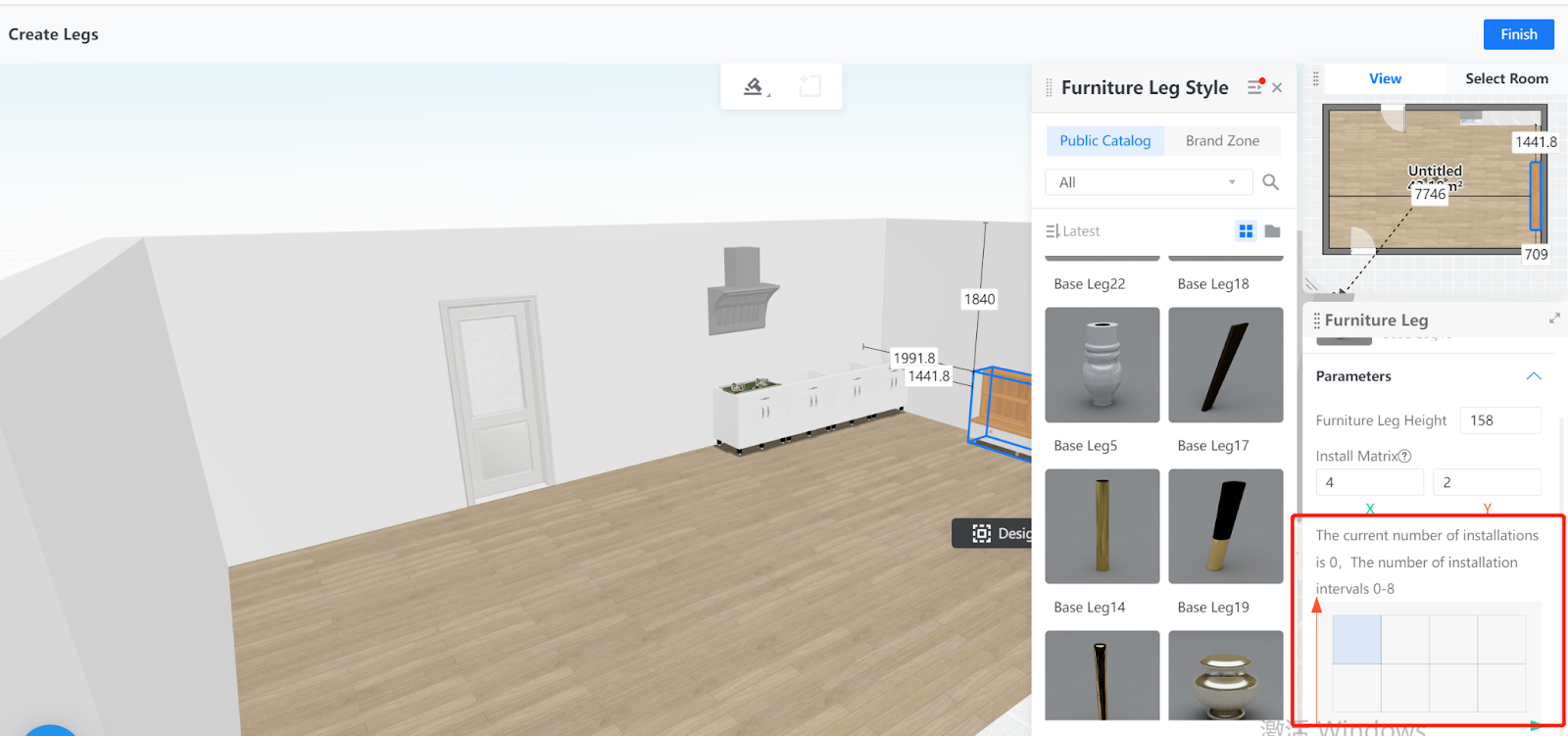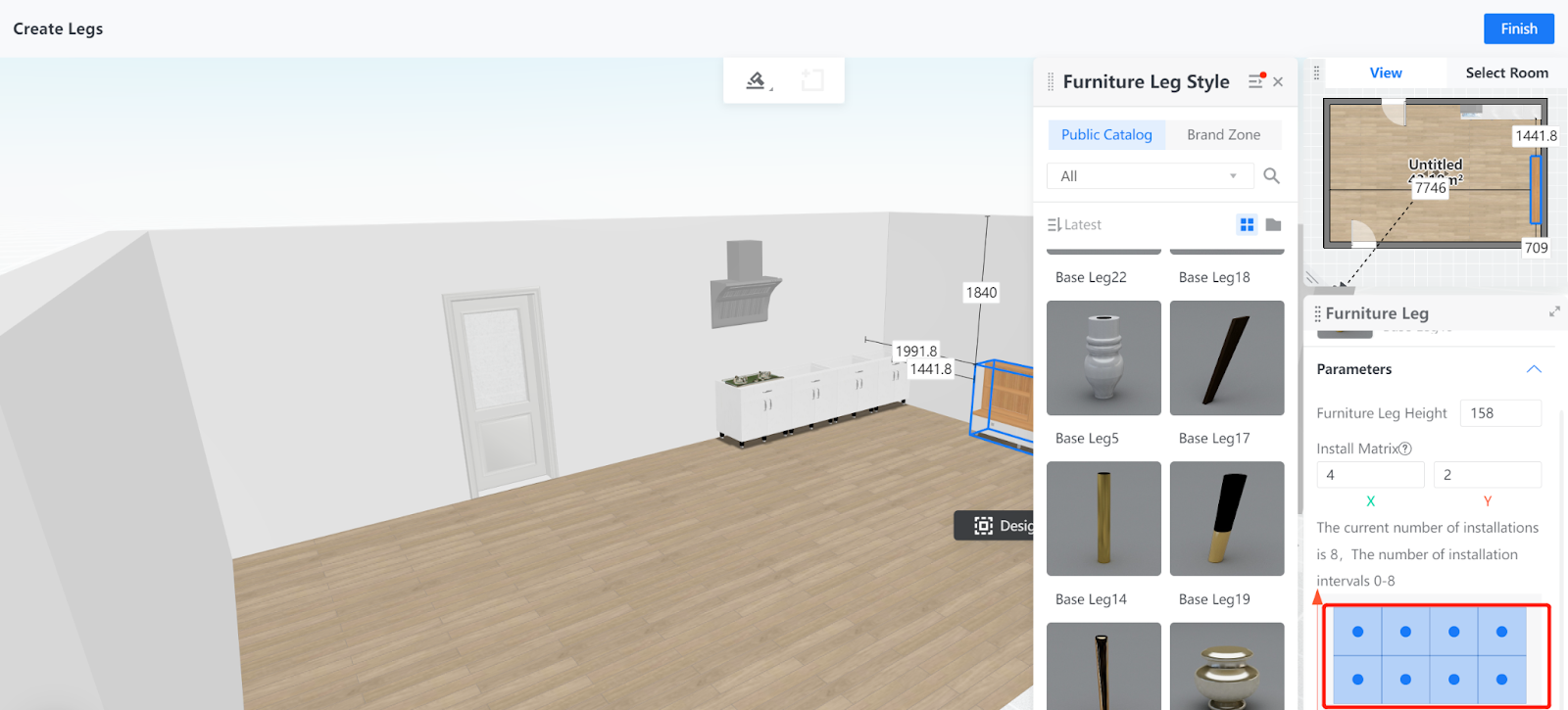5. Apart from height, you can configure the number and position of legs that you install under the cabinets by clicking on the squares in the matrix. The layout of a matrix can determine the possible leg arrangements you can make.
