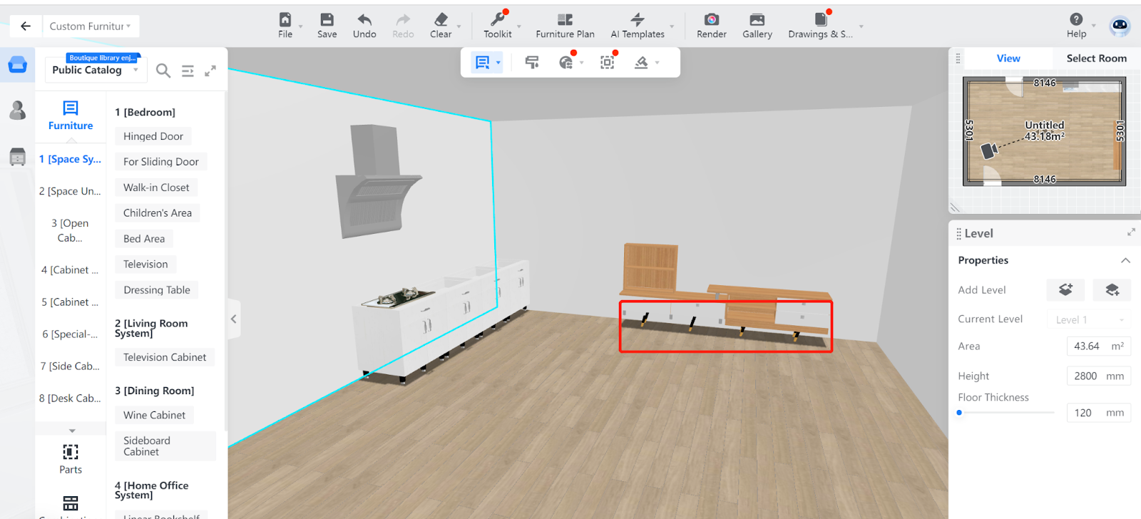 3. Then, click on the cabinet for which you want to generate furniture legs. In this example, a TV cabinet whose left part is preconfigured with legs is selected. You can then replace the existing legs of the left part and also add the replaced ones to the cabinets’ right part.