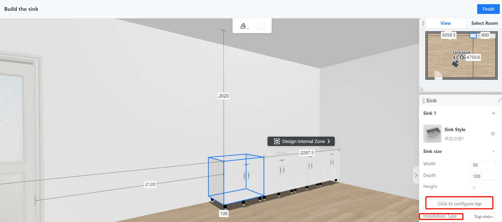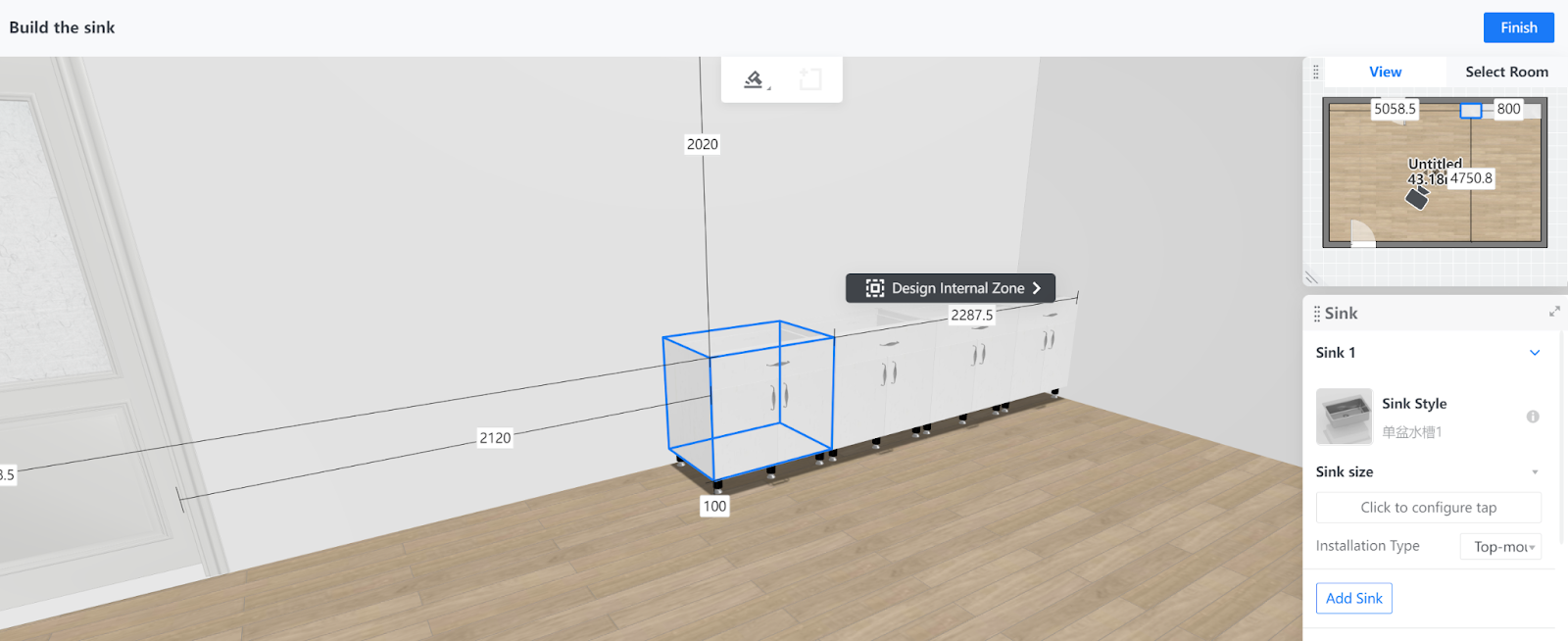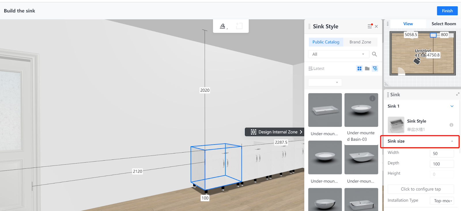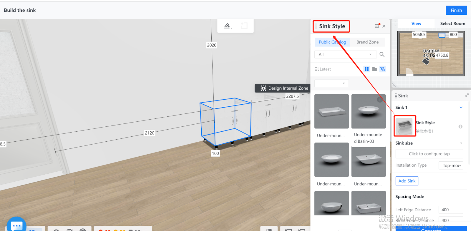 In Coohom, you can generate sinks for the cabinets that you select. You can also configure the sink that you want to generate.